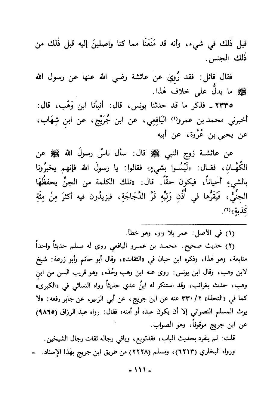 2335 - فَذَكَرَ مَا قَدْ حَدَّثَنَا يُونُسُ، قَالَ: أَنْبَأَنَا ابْنُ وَهْبٍ، قَالَ: أَخْبَرَنِي مُحَمَّدُ بْنُ عَمْرٍو الْيَافِعِيُّ، عَنِ ابْنِ جُرَيْجٍ، عَنِ ابْنِ شِهَابٍ، عَنْ يَحْيَى بْنِ عُرْوَةَ، عَنْ أَبِيهِ، عَنْ عَائِشَةَ زَوْجِ النَّبِيِّ صَلَّى اللَّهُ عَلَيْهِ وَسَلَّمَ قَالَتْ: سَأَلَ نَاسٌ رَسُولَ اللهِ صَلَّى اللَّهُ عَلَيْهِ وَسَلَّمَ عَنِ الْكُهَّانِ، فَقَالَ: " لَيْسُوا بِشَيْءٍ ". فَقَالُوا: يَا رَسُولَ اللهِ فَإِنَّهُمْ يُخْبِرُونَنَا بِالشَّيْءِ أَحْيَانًا فَيَكُونُ حَقًّا. قَالَ: " تِلْكَ الْكَلِمَةُ مِنَ الْجِنِّ يَخْطَفُهَا الْجِنِّيُّ فَيَقُرُّهَا فِي أُذُنِ وَلِيِّهِ قَرَّ الدَّجَاجَةِ، فَيَزِيدُونَ فِيهِ أَكْثَرَ مِنْ مِائَةِ كَذْبَةٍ ". -[114]-