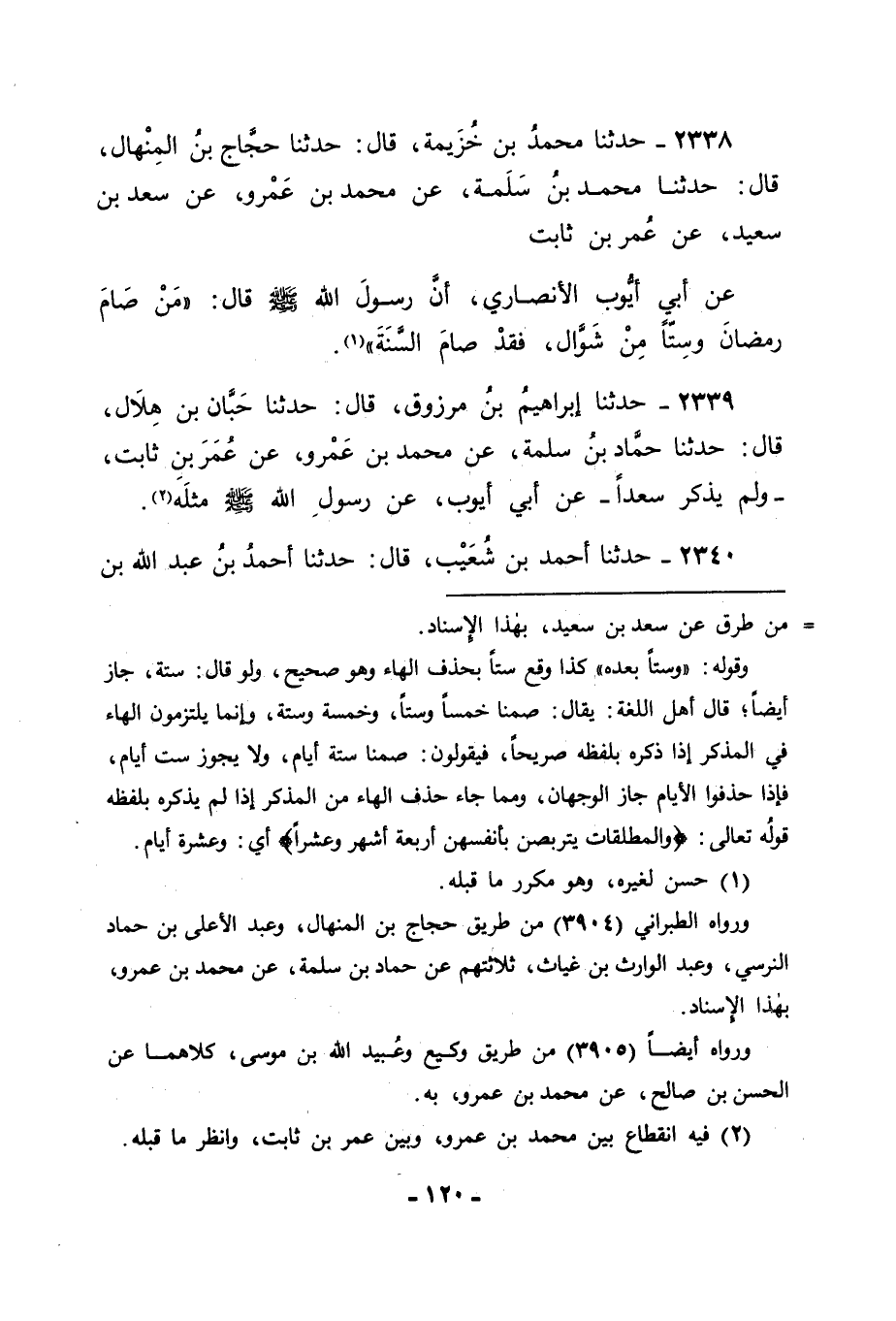 2338 - حَدَّثَنَا مُحَمَّدُ بْنُ خُزَيْمَةَ، قَالَ: حَدَّثَنَا حَجَّاجُ بْنُ الْمِنْهَالِ، قَالَ: حَدَّثَنَا حَماْدُ بْنُ سَلَمَةَ، عَنْ مُحَمَّدِ بْنِ عَمْرٍو، عَنْ سَعْدِ بْنِ سَعِيدٍ، عَنْ عُمَرَ بْنِ ثَابِتٍ، عَنْ أَبِي أَيُّوبَ الْأَنْصَارِيِّ أَنَّ رَسُولَ اللهِ صَلَّى اللَّهُ عَلَيْهِ وَسَلَّمَ قَالَ: " مَنْ صَامَ رَمَضَانَ وَسِتًّا مِنْ شَوَّالٍ فَقَدْ صَامَ السَّنَةَ ".