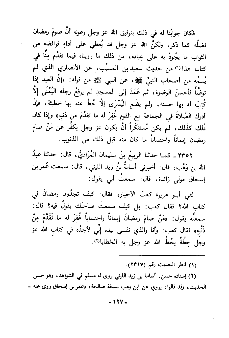 2352 - كَمَا حَدَّثَنَا الرَّبِيعُ بْنُ سُلَيْمَانَ الْمُرَادِيُّ، قَالَ: حَدَّثَنَا عَبْدُ اللهِ بْنُ وَهْبٍ، قَالَ: أَخْبَرَنِي أُسَامَةُ بْنُ زَيْدٍ اللَّيْثِيُّ، قَالَ: سَمِعْتُ عُمَرَ بْنَ إِسْحَاقَ مَوْلَى زَائِدَةَ قَالَ: سَمِعْتُ أَبِي يَقُولُ: لَقِيَ أَبُو هُرَيْرَةَ كَعْبَ الْأَحْبَارِ، فَقَالَ: كَيْفَ تَجِدُونَ رَمَضَانَ فِي كِتَابِ اللهِ؟ فَقَالَ كَعْبٌ بَلْ كَيْفَ سَمِعْتَ صَاحِبَكَ يَقُولُ فِيهِ؟ قَالَ: سَمِعْتُهُ يَقُولُ: " مَنْ صَامَ رَمَضَانَ إيمَانًا وَاحْتِسَابًا غُفِرَ لَهُ مَا تَقَدَّمَ مِنْ ذَنْبِهِ ". فَقَالَ: كَعْبٌ: وَأَنَا وَالَّذِي نَفْسِي بِيَدِهِ إِنِّي لَأَجِدُهُ فِي كِتَابِ اللهِ عَزَّ وَجَلَّ حِطَّةً يَحُطُّ اللهُ عَزَّ وَجَلَّ بِهِ الْخَطَايَا