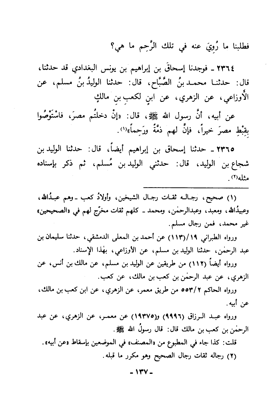 2364 - فَوَجَدْنَا إِسْحَاقَ بْنَ إِبْرَاهِيمَ بْنِ يُونُسَ الْبَغْدَادِيَّ قَدْ حَدَّثَنَا قَالَ: حَدَّثَنَا مُحَمَّدُ بْنُ الصَّبَّاحِ، قَالَ: حَدَّثَنَا الْوَلِيدُ بْنُ مُسْلِمٍ، عَنِ الْأَوْزَاعِيِّ، عَنِ الزُّهْرِيِّ، عَنِ ابْنٍ لِكَعْبِ بْنِ مَالِكٍ، عَنْ أَبِيهِ أَنَّ رَسُولَ اللهِ صَلَّى اللَّهُ عَلَيْهِ وَسَلَّمَ قَالَ: " إِنْ دَخَلْتُمْ مِصْرَ فَاسْتَوْصُوا بِقِبْطِ مِصْرَ خَيْرًا، فَإِنَّ لَهُمْ ذِمَّةً وَرَحِمًا ".