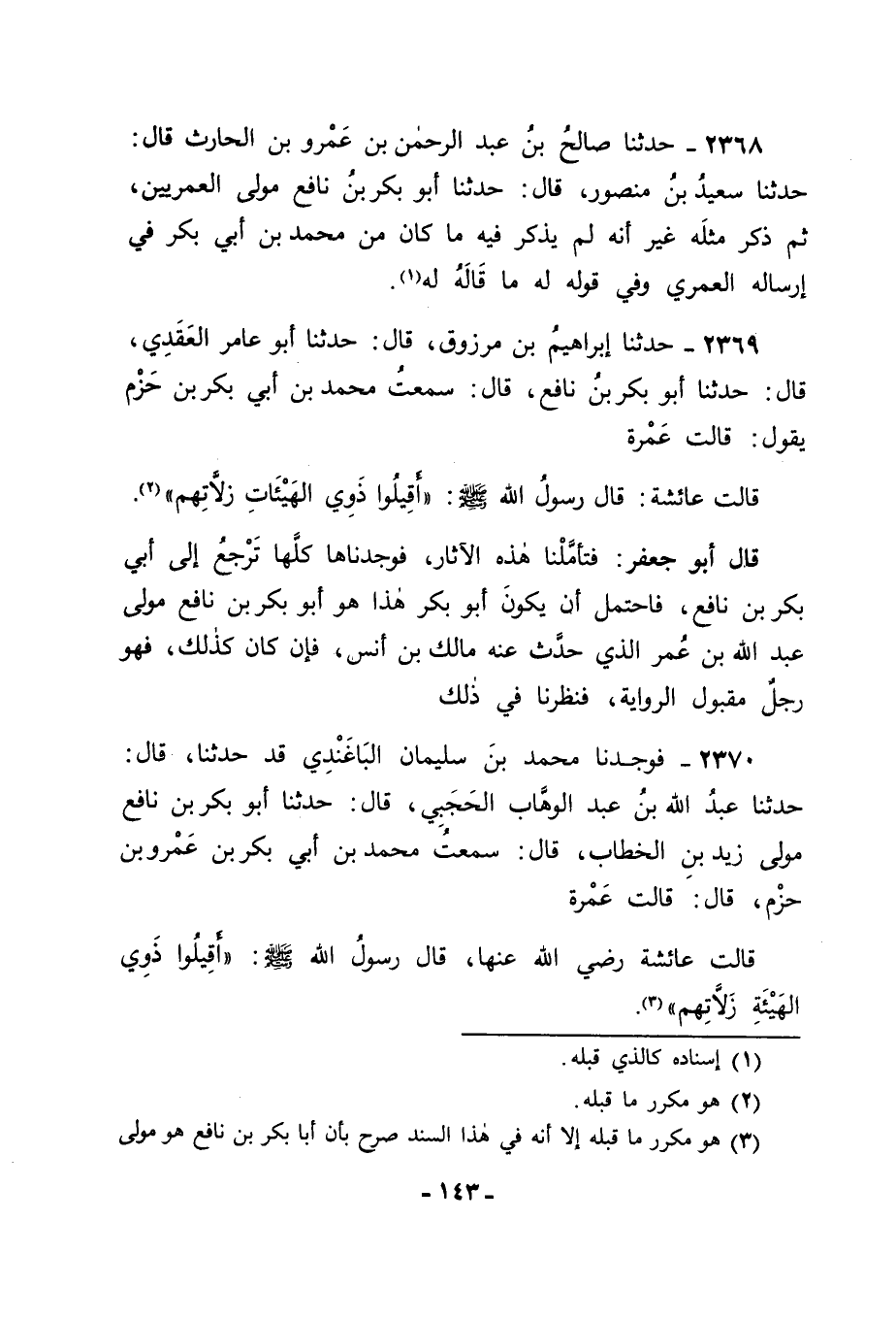 2370 - فَوَجَدْنَا مُحَمَّدَ بْنَ سُلَيْمَانَ الْبَاغَنْدِيَّ قَدْ حَدَّثَنَا قَالَ: حَدَّثَنَا عَبْدُ اللهِ بْنُ عَبْدِ الْوَهَّابِ الْحَجَبِيُّ، قَالَ: حَدَّثَنَا أَبُو بَكْرِ بْنُ نَافِعٍ مَوْلَى زَيْدِ بْنِ الْخَطَّابِ قَالَ: سَمِعْتُ مُحَمَّدَ بْنَ أَبِي بَكْرِ بْنِ عَمْرِو بْنِ حَزْمٍ، قَالَ: قَالَتْ عَمْرَةُ: قَالَتْ عَائِشَةُ رَضِيَ اللهُ عَنْهَا: قَالَ رَسُولُ اللهِ صَلَّى اللَّهُ عَلَيْهِ وَسَلَّمَ: " أَقِيلُوا ذَوِي الْهَيْئَةِ زَلَّاتِهِمْ " -[144]- قَالَ أَبُو جَعْفَرٍ: فَعَقَلْنَا بِذَلِكَ أَنَّهُ غَيْرُ أَبِي بَكْرِ بْنِ نَافِعٍ الَّذِي رَوَى عَنْهُ مَالِكٌ، وَأَنَّهُ فِي الْحَقِيقَةِ مَوْلَى زَيْدِ بْنِ الْخَطَّابِ لَا مَوْلَى عُمَرَ بْنِ الْخَطَّابِ رَضِيَ اللهُ عَنْهُمَا