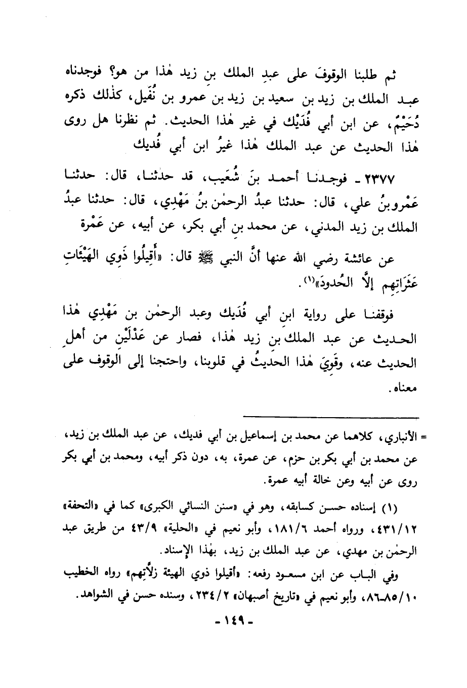 2377 - فَوَجَدْنَا أَحْمَدَ بْنَ شُعَيْبٍ قَدْ حَدَّثَنَا قَالَ: حَدَّثَنَا عَمْرُو بْنُ عَلِيٍّ، قَالَ: حَدَّثَنَا عَبْدُ الرَّحْمَنِ بْنُ مَهْدِيٍّ، قَالَ: حَدَّثَنَا عَبْدُ الْمَلِكِ بْنُ زَيْدٍ الْمَدِينِيُّ، عَنْ مُحَمَّدِ بْنِ أَبِي بَكْرٍ، عَنْ أَبِيهِ، عَنْ عَمْرَةَ، عَنْ عَائِشَةَ رَضِيَ اللهُ عَنْهَا أَنَّ النَّبِيَّ صَلَّى اللَّهُ عَلَيْهِ وَسَلَّمَ قَالَ: " أَقِيلُوا ذَوِي الْهَيْئَاتِ عَثَرَاتِهِمْ إِلَّا الْحُدُودَ " فَوَقَفْنَا عَلَى رِوَايَةِ ابْنِ أَبِي فُدَيْكٍ، وَعَبْدِ الرَّحْمَنِ بْنِ مَهْدِيٍّ هَذَا الْحَدِيثَ عَنْ عَبْدِ الْمَلِكِ بْنِ زَيْدٍ هَذَا، فَصَارَ عَنْ عَدْلَيْنِ مِنْ أَهْلِ الْحَدِيثِ عَنْهُ، وَقَوِيَ هَذَا الْحَدِيثُ فِي قُلُوبِنَا، وَاحْتَجْنَا إِلَى الْوُقُوفِ عَلَى مَعْنَاهُ، -[150]- فَوَجَدْنَا الْمُتَقَدِّمِينَ مِنْ أَهْلِ الْعِلْمِ قَدْ جَعَلُوا الْمُرَادِينَ بِالتَّجَافِي عَنْ تِلْكَ الزَّلَّاتِ الْأَئِمَّةَ، وَجَعَلُوهُمْ مَأْمُورِينَ بِالتَّجَافِي عَنْهَا عَنْ ذَوِي الْهَيْئَةِ , ثُمَّ نَظَرْنَا فِي ذَوِي الْهَيْئَةِ