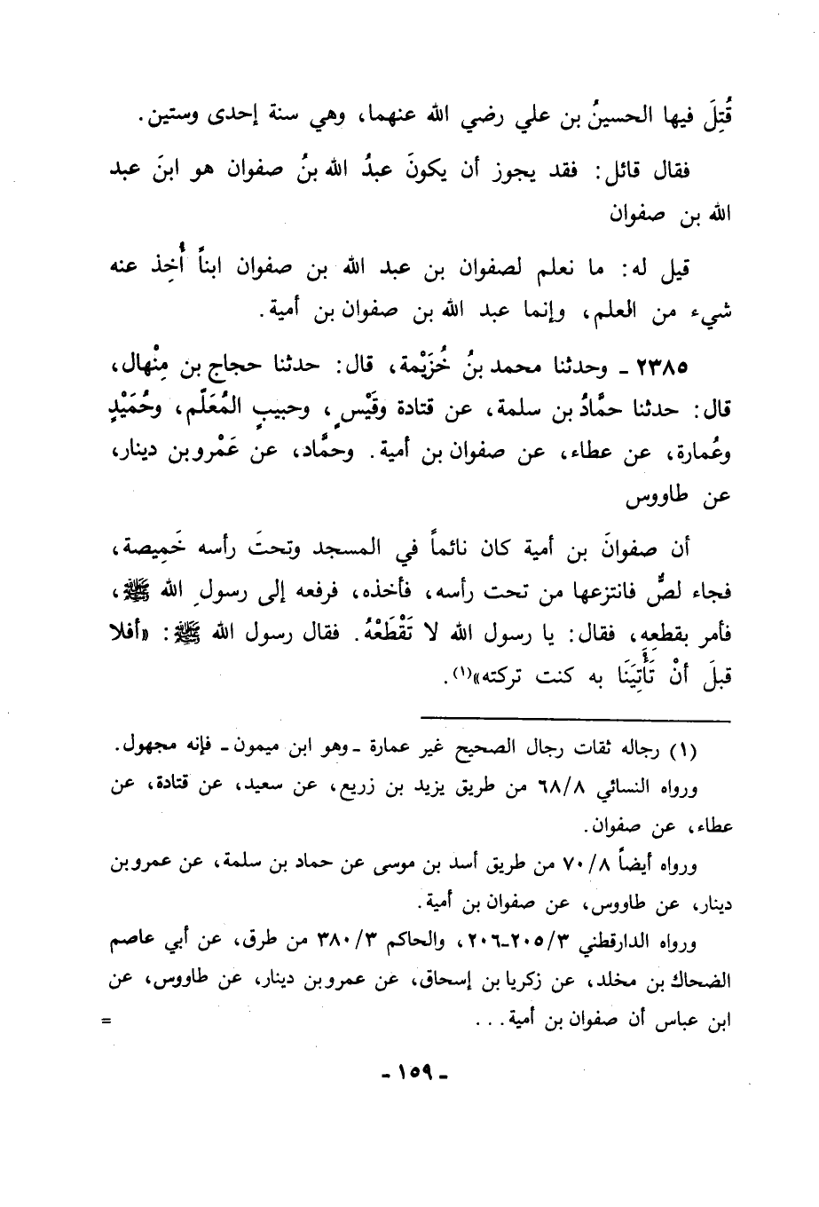 2385 - وَحَدَّثَنَا مُحَمَّدُ بْنُ خُزَيْمَةَ، قَالَ: حَدَّثَنَا حَجَّاجُ بْنُ مِنْهَالٍ، قَالَ: حَدَّثَنَا حَمَّادُ بْنُ سَلَمَةَ، عَنْ قَتَادَةَ، وَقَيْسٍ، وَحَبِيبٍ الْمُعَلِّمِ، وَحُمَيْدٍ، وَعُمَارَةَ، عَنْ عَطَاءٍ، عَنْ صَفْوَانَ بْنِ أُمَيَّةَ وَحَمَّادٍ، عَنْ عَمْرِو بْنِ دِينَارٍ، عَنْ طَاوُسٍ أَنَّ صَفْوَانَ بْنَ أُمَيَّةَ كَانَ نَائِمًا فِي الْمَسْجِدِ وَتَحْتَ رَأْسِهِ خَمِيصَةٌ، فَجَاءَ لِصٌّ فَانْتَزَعَهَا مِنْ تَحْتِ رَأْسِهِ، فَأَخَذَهُ فَرَفَعَهُ إِلَى رَسُولِ اللهِ صَلَّى اللَّهُ عَلَيْهِ وَسَلَّمَ، فَأَمَرَ بِقَطْعِهِ، فَقَالَ: يَا رَسُولَ اللهِ، لَا تَقْطَعْهُ. فَقَالَ رَسُولُ اللهِ صَلَّى اللَّهُ عَلَيْهِ وَسَلَّمَ: " أَفَلَا قَبْلَ أَنْ تَأْتِيَنَا بِهِ كُنْتَ تَرَكْتَهُ "؟ -[160]- فَنَظَرْنَا فِي هَذَا الْحَدِيثِ هَلْ هُوَ سَمَاعٌ لَفْظًا مِنْ صَفْوَانَ أَمْ لَا
