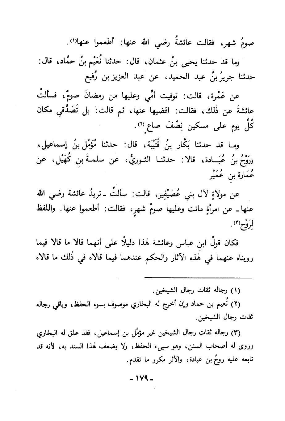 وَمَا قَدْ حَدَّثَنَا بَكَّارُ بْنُ قُتَيْبَةَ قَالَ: حَدَّثَنَا مُؤَمَّلُ بْنُ إِسْمَاعِيلَ وَرَوْحُ بْنُ عُبَادَةَ قَالَا: حَدَّثَنَا الثَّوْرِيُّ، عَنْ سَلَمَةَ بْنِ كُهَيْلٍ، عَنْ عُمَارَةَ بْنِ عُمَيْرٍ، عَنْ مَوْلَاةٍ لِآلِ بَنِي عُصَيْفِيرٍ قَالَتْ: سَأَلْتُ تُرِيدُ عَائِشَةَ رَضِيَ اللهُ عَنْهَا عَنِ امْرَأَةٍ مَاتَتْ وَعَلَيْهَا صَوْمُ شَهْرٍ، فَقَالَتْ: " أَطْعِمُوا عَنْهَا. وَاللَّفْظُ لِرَوْحٍ فَكَانَ قَوْلُ ابْنِ عَبَّاسٍ وَعَائِشَةَ هَذَا دَلِيلًا عَلَى أَنَّهُمَا قَالَا مَا قَالَا فِيمَا رَوَيْنَاهُ عَنْهُمَا فِي هَذِهِ الْآثَارِ، وَالْحُكْمُ عِنْدَهُمَا فِيمَا قَالَاهُ فِي ذَلِكَ مَا قَالَاهُ -[180]- فِيهِ، وَلَا يَجُوزُ أَنْ يَكُونَ ذَلِكَ مِنْهُمَا إِلَّا بَعْدَ ثُبُوتِ نَسْخِ مَا سَمِعَاهُ مِنَ النَّبِيِّ صَلَّى اللَّهُ عَلَيْهِ وَسَلَّمَ فِيهِ , وَلَوْلَا ذَلِكَ سَقَطَ عَدْلُهُمَا، وَكَانَ فِي سُقُوطِ عَدْلِهِمَا سُقُوطُ رِوَايَتِهِمَا، وَحَاشَ لِلَّهِ عَزَّ وَجَلَّ أَنْ يَكُونَا كَذَلِكَ، وَلَكِنَّهُمَا عَلَى عَدْلِهِمَا وَعَلَى أَنَّهُمَا لَمْ يَتْرُكَا مَا سَمِعَاهُ مِنَ النَّبِيِّ صَلَّى اللَّهُ عَلَيْهِ وَسَلَّمَ إِلَّا إِلَى مَا سَمِعَاهُ مِنْهُ مِمَّا قَالَاهُ بَعْدَهُ، وَهُمَا عِنْدَنَا فِي ذَلِكَ كَمِثْلِ مَا قَالَ مُحَمَّدُ بْنُ سِيرِينَ مِمَّا حَدَّثَنَاهُ يُونُسُ قَالَ: أَنْبَأَنَا ابْنُ وَهْبٍ قَالَ: أَخْبَرَنِي جَرِيرُ بْنُ -[181]- حَازِمٍ، عَنْ مُحَمَّدِ بْنِ سِيرِينَ فِي الْمُتْعَةِ - يَعْنِي مُتْعَةَ الْحَجِّ - قَالَ: هُمْ - يَعْنِي أَصْحَابَ النَّبِيِّ صَلَّى اللَّهُ عَلَيْهِ وَسَلَّمَ - حَضَرُوهَا، وَهُمْ نَهَوْا عَنْهَا. فَمَا فِي مَذْهَبِهِمْ مَا يُتَّهَمُ، وَلَا فِي رَأْيِهِمْ مَا يُسْتَقْصَرُ. وَاللهَ نَسْأَلُهُ التَّوْفِيقَ
