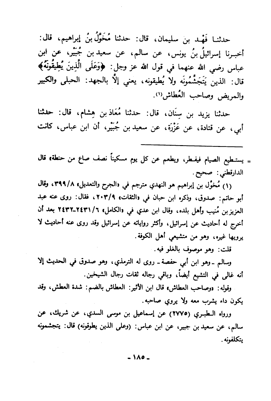 حَدَّثَنَا فَهْدُ بْنُ سُلَيْمَانَ قَالَ: حَدَّثَنَا مُخَوَّلُ بْنُ إِبْرَاهِيمَ قَالَ: حَدَّثَنَا إسْرَائِيلُ بْنُ يُونُسَ، عَنْ سَالِمٍ، عَنْ سَعِيدِ بْنِ جُبَيْرٍ، عَنِ ابْنِ عَبَّاسٍ رَضِيَ اللهُ عَنْهُمَا فِي قَوْلِ اللهِ عَزَّ وَجَلَّ: {وَعَلَى الَّذِينَ يُطِيقُونَهُ} [البقرة: 184] قَالَ: " الَّذِينَ يَتَجَشَّمُونَهُ وَلَا يُطِيقُونَهُ - يَعْنِي إِلَّا بِالْجَهْدِ -: الْحُبْلَى، وَالْكَبِيرُ، وَالْمَرِيضُ، وَصَاحِبُ الْعُطَاشِ "