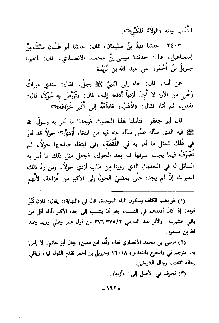 2403 - حَدَّثَنَا فَهْدُ بْنُ سُلَيْمَانَ، قَالَ: حَدَّثَنَا أَبُو غَسَّانَ مَالِكُ بْنُ إِسْمَاعِيلَ قَالَ: حَدَّثَنَا مُوسَى بْنُ مُحَمَّدٍ الْأَنْصَارِيُّ، قَالَ: أَخْبَرَنَا جِبْرِيلُ بْنُ أَحْمَرَ، عَنْ عَبْدِ اللهِ بْنِ بُرَيْدَةَ، عَنْ أَبِيهِ، قَالَ: جَاءَ إِلَى النَّبِيِّ صَلَّى اللَّهُ عَلَيْهِ وَسَلَّمَ رَجُلٌ، فَقَالَ: عِنْدِي مِيرَاثُ رَجُلٍ مِنَ الْأَزْدِ، لَا أَجِدُ أَزْدِيًّا أَدْفَعُهُ إلَيْهِ. قَالَ: " تَرَبَّصْ بِهِ حَوْلًا ". قَالَ: فَفَعَلَ، ثُمَّ أَتَاهُ، فَقَالَ: " اذْهَبْ فَادْفَعْهُ إِلَى أَكْبَرِ خُزَاعَةَ " قَالَ أَبُو جَعْفَرٍ: فَتَأَمَّلْنَا هَذَا الْحَدِيثَ، فَوَجَدْنَا مَا أَمَرَ بِهِ رَسُولُ اللهِ صَلَّى اللَّهُ عَلَيْهِ وَسَلَّمَ فِيهِ الَّذِي سَأَلَهُ عَمَّنْ سَأَلَهُ عَنْهُ فِيهِ مِنَ ابْتِغَاءِ أَزْدِيٍّ حَوْلًا قَدْ أَمَرَ فِي ذَلِكَ كَمِثْلِ مَا أَمَرَ بِهِ فِي اللُّقَطَةِ، وَفِي ابْتِغَاءِ صَاحِبِهَا حَوْلًا، ثُمَّ تُصْرَفُ فِيمَا يَجِبُ صَرْفُهَا فِيهِ بَعْدَ الْحَوْلِ، فَجَعَلَ مِثْلَ ذَلِكَ مَا أَمَرَ بِهِ السَّائِلَ لَهُ فِي الْحَدِيثِ الَّذِي رَوَيْنَا مِنْ طَلَبِ أَزْدِيٍّ حَوْلًا، وَمِنْ رَدِّ ذَلِكَ الْمِيرَاثِ إِنْ لَمْ يَجِدْهُ حَتَّى يَمْضِيَ الْحَوْلُ إِلَى الْأَكْبَرِ مِنْ خُزَاعَةَ؛ لِأَنَّهُمْ -[193]- مِنَ الْأَزْدِ، وَإِنَّمَا انْخَزَعُوا مِنْهُمْ لَمَّا خَرَجُوا مِنَ الْيَمَنِ فَصَارُوا إِلَى مَكَّةَ، وَهُمْ بَنُو مَازِنِ بْنِ الْأَسْوَدِ بْنِ الْغَوْثِ بْنِ نَبْتِ بْنِ مَالِكِ بْنِ زَيْدِ بْنِ كَهْلَانَ بْنِ سَبَأِ بْنِ يَشْجُبَ بْنِ يَعْرُبَ بْنِ قَحْطَانَ، فَحَالَفُوا بِمَكَّةَ مَنْ حَالَفُوهُ بِهَا، فَصَارُوا بِذَلِكَ حُلَفَاءَ بَنِي هَاشِمٍ. فَقَالَ قَائِلٌ: فَكَيْفَ يَجُوزُ أَنْ يَكُونَ مَا فِي هَذَا الْحَدِيثِ كَمَا ذُكِرَ فِيهِ مِنْ عَدَمِ الَّذِي كَانَ ذَلِكَ الْمِيرَاثُ عِنْدَهُ وُجُودَ أَزْدِيٍّ يَسْتَحِقُّهُ حَتَّى يَطْلُبَهُ مِنْ خُزَاعَةَ، وَالْأَنْصَارُ مَعَ رَسُولِ اللهِ صَلَّى اللَّهُ عَلَيْهِ وَسَلَّمَ وَهُمْ مِنَ الْأَزْدِ، وَهُمْ أَقْرَبُ إِلَى ذَلِكَ الْمُتَوَفَّى مِنْ خُزَاعَةَ؛ لِأَنَّ خُزَاعَةَ لَمَّا انْخَزَعَتْ سُمِّيَتْ بِذَلِكَ، وَهِيَ مِنْ بَطْنٍ بِعَيْنِهِ مِنَ الْأَزْدِ، وَمَنْ سِوَاهَا مِنَ الْأَزْدِ لَيْسَ مِنْ ذَلِكَ الْبَطْنِ، فَنُسِبَتْ هِيَ إِلَى مَا نُسِبَتْ إلَيْهِ، وَبَانَتْ بِذَلِكَ مِنَ الْأَزْدِ، وَبَقِيَ مَنْ سِوَاهَا مِنْ بُطُونِ الْأَزْدِ عَلَى مَا كَانُوا عَلَيْهِ قَبْلَ ذَلِكَ مِنَ النِّسْبَةِ إِلَى الْأَزْدِ، كَمَا قَدْ بَانَتْ أَفْخَاذُ قُرَيْشٍ مِنْ قُرَيْشٍ بِمَا هِيَ مِنْ أَفْخَاذِ قُرَيْشٍ، فَقِيلَ الْهَاشِمِيُّونَ لِلْهَاشِمِيِّينَ، وَالْعَبْشَمِيُّونَ لِعَبْدِ شَمْسٍ، حَتَّى قِيلَ فِي بُطُونِ قُرَيْشٍ كَذَلِكَ وَقُرَيْشٌ تَجْمَعُهَا كُلَّهَا؟ فَكَانَ جَوَابُنَا لَهُ فِي ذَلِكَ بِتَوْفِيقِ اللهِ وَعَوْنِهِ أَنَّ هَذَا يَحْتَمِلُ أَنْ يَكُونَ كَانَ بِمَكَّةَ قَبْلَ أَنْ يُهَاجِرَ رَسُولُ اللهِ صَلَّى اللَّهُ عَلَيْهِ وَسَلَّمَ مِنْهَا إِلَى الْمَدِينَةِ، وَقَبْلَ إسْلَامِ الْأَنْصَارِ، وَمِمَّا يُقَرِّبُ أَنَّ ذَلِكَ كَذَلِكَ فِي الْقُلُوبِ أَنَّ الَّذِي رَوَى هَذَا الْحَدِيثَ عَنِ النَّبِيِّ صَلَّى اللَّهُ عَلَيْهِ وَسَلَّمَ هُوَ بُرَيْدَةَ بْنُ الْحُصَيْبِ، وَهُوَ رَجُلٌ مِنْ أَسْلَمَ، وَأَسْلَمُ مِنْ خُزَاعَةَ، إسْلَامُ أَسْلَمَ وَإسْلَامُ خُزَاعَةَ كَانَ وَالنَّبِيُّ صَلَّى اللَّهُ عَلَيْهِ وَسَلَّمَ بِمَكَّةَ. فَكَانَ مَا أَمَرَ بِهِ رَسُولُ اللهِ صَلَّى اللَّهُ عَلَيْهِ وَسَلَّمَ الَّذِي سَأَلَهُ عَنْ مَا سَأَلَهُ عَنْهُ فِي حَدِيثِهِ، وَجَوَا