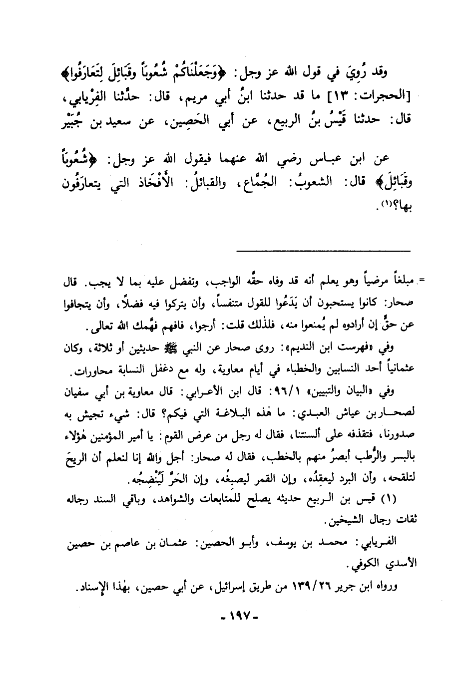 مَا قَدْ حَدَّثَنَا ابْنُ أَبِي مَرْيَمَ قَالَ: حَدَّثَنَا الْفِرْيَابِيُّ قَالَ: حَدَّثَنَا قَيْسُ بْنُ الرَّبِيعِ، عَنْ أَبِي الْحُصَيْنِ، عَنْ سَعِيدِ بْنِ جُبَيْرٍ، عَنِ ابْنِ عَبَّاسٍ رَضِيَ اللهُ عَنْهُمَا فِي قَوْلِ اللهِ عَزَّ وَجَلَّ: {شُعُوبًا وَقَبَائِلَ} [الحجرات: 13] , قَالَ: " الشُّعُوبُ الْجُمَّاعُ، وَالْقَبَائِلُ الْأَفْخَاذُ الَّتِي يَتَعَارَفُونَ بِهَا "