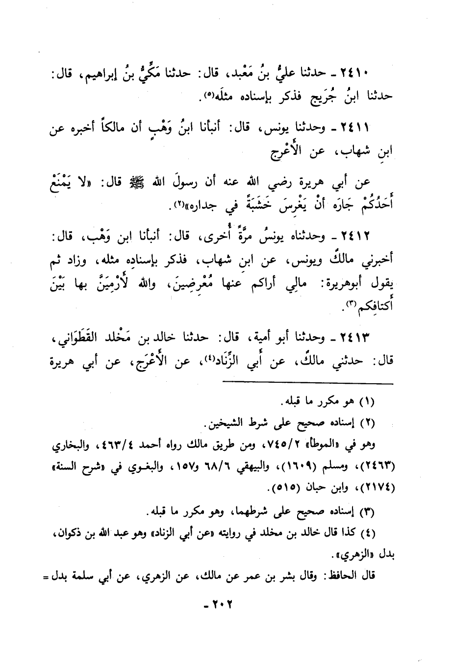 2411 - وَحَدَّثَنَا يُونُسُ، قَالَ: أَنْبَأَنَا ابْنُ وَهْبٍ أَنَّ مَالِكًا أَخْبَرَهُ عَنِ ابْنِ شِهَابٍ، عَنِ الْأَعْرَجِ، عَنْ أَبِي هُرَيْرَةَ رَضِيَ اللهُ عَنْهُ أَنَّ رَسُولَ اللهِ صَلَّى اللَّهُ عَلَيْهِ وَسَلَّمَ قَالَ: " لَا يَمْنَعْ أَحَدُكُمْ جَارَهُ أَنْ يَغْرِسَ خَشَبَةً فِي جِدَارِهِ "