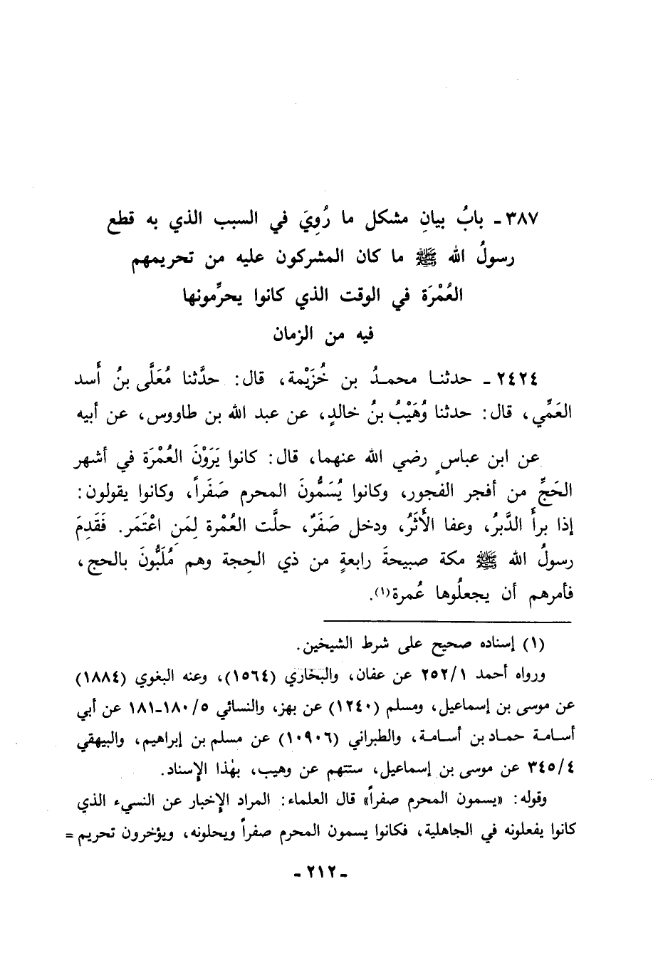 2424 - حَدَّثَنَا مُحَمَّدُ بْنُ خُزَيْمَةَ، قَالَ: حَدَّثَنَا مُعَلَّى بْنُ أَسَدٍ الْعَمِّيُّ، قَالَ: حَدَّثَنَا وُهَيْبُ بْنُ خَالِدٍ، عَنْ عَبْدِ اللهِ بْنِ طَاوُسٍ، عَنْ أَبِيهِ، عَنِ ابْنِ عَبَّاسٍ رَضِيَ اللهُ عَنْهُمَا قَالَ: كَانُوا يَرَوْنَ الْعُمْرَةَ فِي أَشْهُرِ الْحَجِّ مِنْ أَفْجَرِ الْفُجُورِ، وَكَانُوا يُسَمُّونَ الْمُحَرَّمَ صَفَرًا، وَكَانُوا يَقُولُونَ: إِذَا بَرَأَ الدَّبَرُ، وَعَفَا الْأَثَرُ، وَدَخَلَ صَفَرٌ، حَلَّتِ الْعُمْرَةُ لِمَنِ اعْتَمَرَ. فَقَدِمَ رَسُولُ اللهِ صَلَّى اللَّهُ عَلَيْهِ وَسَلَّمَ مَكَّةَ صَبِيحَةَ رَابِعَةٍ مِنْ ذِي الْحِجَّةِ وَهُمْ مُلَبُّونَ بِالْحَجِّ، فَأَمَرَهُمْ أَنْ يَجْعَلُوهَا عُمْرَةً " -[213]-