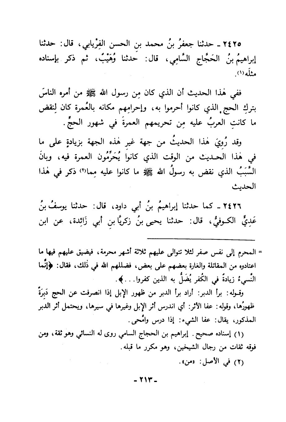 2427 - كَمَا حَدَّثَنَا جَعْفَرُ بْنُ مُحَمَّدٍ الْفِرْيَابِيُّ، قَالَ: ثنا الْحَسَنُ بْنُ سَهْلٍ الْحَنَّاطُ، وَكَانَ يُلَقَّبُ خَرَبُوشًا، قَالَ: ثنا -[215]- يَحْيَى بْنُ أَبِي زَائِدَةَ، قَالَ: ثنا ابْنُ جُرَيْجٍ، وَابْنُ إِسْحَاقَ، عَنْ عَبْدِ اللهِ بْنِ طَاوُسٍ، عَنْ أَبِيهِ، عَنِ ابْنِ عَبَّاسٍ رَضِيَ اللهُ عَنْهُمَا، ثُمَّ ذَكَرَ مِثْلَهُ، غَيْرَ أَنَّهُ قَالَ فِي آخِرِهِ: " إِلَّا لِنَقْضِ ذَلِكَ مِنْ قَوْلِهِمْ " فَاخْتَلَفَ يُوسُفُ بْنُ عَدِيٍّ وَالْحَسَنُ بْنُ سَهْلٍ فِي إسْنَادِ هَذَا الْحَدِيثِ , فَقَالَ يُوسُفُ فِيهِ: عَنِ ابْنِ جُرَيْجٍ، عَنْ مُحَمَّدِ بْنِ إِسْحَاقَ. وَقَالَ الْحَسَنُ فِيهِ: عَنِ ابْنِ جُرَيْجٍ وَابْنِ إِسْحَاقَ. وَفِي هَذَا الْحَدِيثِ أَنَّهُمْ كَانُوا يُحَرِّمُونَ الْعُمْرَةَ فِي الْمُحَرَّمِ وَلَيْسَ مِنْ شُهُورِ الْحَجِّ، كَمَا كَانُوا يُحَرِّمُونَهَا فِي مَا قَبْلَهُ مِنْ شُهُورِ الْحَجِّ، وَذَلِكَ عِنْدَنَا وَاللهُ أَعْلَمُ وَهْمٌ مِنْ مُحَمَّدِ بْنِ إِسْحَاقَ؛ لِأَنَّ الْمُسْتَفِيضَ عِنْدَ النَّاسِ مِنْ تَحْرِيمِ الْعَرَبِ الْعُمْرَةَ إِنَّمَا كَانَ فِي شُهُورِ الْحَجِّ لَا فِيمَا -[216]- سِوَاهَا، وَكَذَلِكَ هُوَ مَنْصُوصٌ فِي حَدِيثِ وُهَيْبٍ الَّذِي قَدْ رَوَيْنَاهُ فِيهِ أَيْضًا أَنَّهُمْ كَانُوا يُسَمُّونَ الْمُحَرَّمَ صَفَرًا، فَفِي ذَلِكَ مَا قَدْ دَلَّ عَلَى أَنَّهُمْ إِنَّمَا كَانُوا يُرِيدُونَ بِقَوْلِهِمْ: " وَدَخَلَ صَفَرٌ " أَيْ دَخَلَ الْمُحَرَّمُ الَّذِي كَانُوا يُسَمُّونَهُ صَفَرًا، لَا يُرِيدُونَ بِذَلِكَ صَفَرًا الَّذِي يَعْقُبُ الْمُحَرَّمَ. وَقَدْ رُوِيَ عَنْ عَبْدِ الرَّزَّاقِ هَذَا الْحَدِيثُ عَنْ مَعْمَرٍ وَابْنِ جُرَيْجٍ