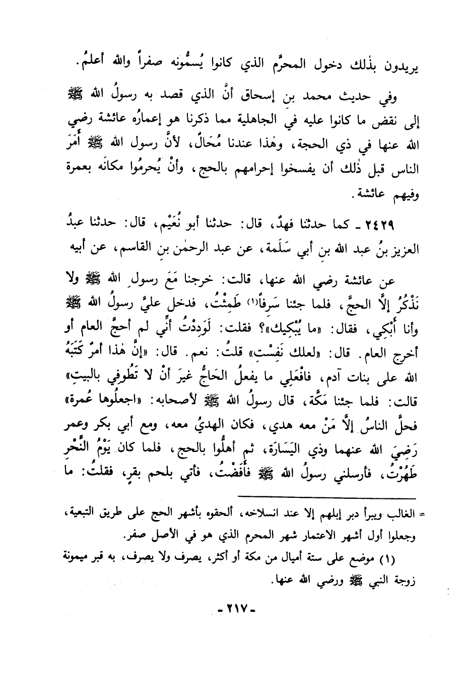 2429 - كَمَا حَدَّثَنَا فَهْدٌ، قَالَ: حَدَّثَنَا أَبُو نُعَيْمٍ، قَالَ: حَدَّثَنَا عَبْدُ الْعَزِيزِ بْنُ عَبْدِ اللهِ بْنِ أَبِي سَلَمَةَ، عَنْ عَبْدِ الرَّحْمَنِ بْنِ الْقَاسِمِ، عَنْ أَبِيهِ، عَنْ عَائِشَةَ رَضِيَ اللهُ عَنْهَا قَالَتْ: خَرَجْنَا مَعَ رَسُولِ اللهِ صَلَّى اللَّهُ عَلَيْهِ وَسَلَّمَ وَلَا نَذْكُرُ إِلَّا الْحَجَّ، فَلَمَّا جِئْنَا سَرِفَ طَمِثْتُ، فَدَخَلَ عَلَيَّ رَسُولُ اللهِ صَلَّى اللَّهُ عَلَيْهِ وَسَلَّمَ وَأَنَا أَبْكِي، فَقَالَ: " مَا يُبْكِيكِ؟ " فَقُلْتُ: لَوَدِدْتُ أَنِّي لَمْ أَحُجَّ الْعَامَ أَوْ أَخْرُجَ الْعَامَ. قَالَ: " لَعَلَّكِ نَفِسْتِ "؟ قُلْتُ: نَعَمْ. قَالَ: " إِنَّ هَذَا أَمْرٌ كَتَبَهُ اللهُ عَلَى بَنَاتِ آدَمَ، فَافْعَلِي مَا يَفْعَلُ الْحَاجُّ غَيْرَ أَنْ لَا تَطُوفِي بِالْبَيْتِ ". قَالَتْ: فَلَمَّا جِئْنَا مَكَّةَ قَالَ رَسُولُ اللهِ صَلَّى اللَّهُ عَلَيْهِ وَسَلَّمَ لِأَصْحَابِهِ: " اجْعَلُوهَا عُمْرَةً ". فَحَلَّ النَّاسُ إِلَّا مَنْ مَعَهُ هَدْيٌ، فَكَانَ الْهَدْيُ مَعَهُ , وَمَعَ أَبِي بَكْرٍ وَعُمَرَ رَضِيَ اللهُ عَنْهُمَا وَذِي الْيَسَارَةِ، ثُمَّ أَهَلُّوا بِالْحَجِّ، فَلَمَّا كَانَ يَوْمُ النَّحْرِ طَهُرْتُ، فَأَرْسَلَنِي رَسُولُ اللهِ صَلَّى اللَّهُ عَلَيْهِ وَسَلَّمَ فَأَفَضْتُ، فَأُتِيَ بِلَحْمِ بَقَرٍ، فَقُلْتُ: مَا -[218]- هَذَا؟ فَقَالُوا: أَهْدَى رَسُولُ اللهِ صَلَّى اللَّهُ عَلَيْهِ وَسَلَّمَ عَنْ نِسَائِهِ الْبَقَرَ، حَتَّى إِذَا كَانَتْ لَيْلَةُ الْحَصْبَةِ قُلْتُ: يَا رَسُولَ اللهِ، يَرْجِعُ النَّاسُ بِحَجَّةٍ وَعُمْرَةٍ، وَأَرْجِعُ بِحَجَّةٍ؟ فَأَمَرَ عَبْدَ الرَّحْمَنِ بْنَ أَبِي بَكْرٍ فَأَرْدَفَنِي خَلْفَهُ، فَإِنِّي لَأَذْكُرُ أَنِّي كُنْتُ أَنْعَسُ، فَيَضْرِبُ وَجْهِي مُؤْخِرَةُ الرَّحْلِ، حَتَّى جِئْنَا التَّنْعِيمَ، فَأَهْلَلْتُ بِعُمْرَةٍ جَزَاءَ عُمْرَةِ النَّاسِ الَّتِي اعْتَمَرُوهَا " قَالَ أَبُو جَعْفَرٍ: فَفِي هَذَا الْحَدِيثِ عَنْ عَائِشَةَ أَنَّهُمْ خَرَجُوا مَعَ رَسُولِ اللهِ صَلَّى اللَّهُ عَلَيْهِ وَسَلَّمَ وَهِيَ مِنْهُمْ، وَلَا يَذْكُرُونَ إِلَّا الْحَجَّ , وَأَنَّ رَسُولَ اللهِ صَلَّى اللَّهُ عَلَيْهِ وَسَلَّمَ أَمَرَ النَّاسَ أَنْ يَجْعَلُوهَا عُمْرَةً إِلَّا مَنْ كَانَ مَعَهُ الْهَدْيُ، وَأَنَّهَا قَالَتْ لِرَسُولِ اللهِ صَلَّى اللَّهُ عَلَيْهِ وَسَلَّمَ لَيْلَةَ الْحَصْبَةِ: أَيَرْجِعُ النَّاسُ بِحَجَّةٍ وَعُمْرَةٍ وَأَرْجِعُ بِحَجَّةٍ؟ وَهَذَا مِمَّا يَجِبُ أَنْ يُوقَفَ عَلَيْهِ وَأَنْ يُكْشَفَ مَعْنَاهُ؛ لِأَنَّ أَصْحَابَ رَسُولِ اللهِ صَلَّى اللَّهُ عَلَيْهِ وَسَلَّمَ -[219]- كَانُوا فَسَخُوا الْحَجَّ الَّذِي كَانُوا أَحْرَمُوا بِهِ وَأَحْرَمُوا مَكَانَهُ بِعُمْرَةٍ، فَكَشَفْنَا ذَلِكَ فَوَجَدْنَاهُ مُحْتَمِلًا أَنْ تَكُونَ عَائِشَةُ أَحْرَمَتْ بِالْحَجِّ كَمَا أَحْرَمَ النَّاسُ بِهِ، ثُمَّ عَادَ إحْرَامُهَا إِلَى الْعُمْرَةِ الَّتِي عَادَ إحْرَامُ النَّاسِ إِلَى مِثْلِهَا، ثُمَّ أَدْرَكَهَا الْحَيْضُ فَأَمَرَهَا رَسُولُ اللهِ صَلَّى اللَّهُ عَلَيْهِ وَسَلَّمَ بِرَفْضِهَا وَالْإِحْرَامِ بِالْحَجِّ مَكَانَهَا، وَاتَّسَعَ لَهَا بِذَلِكَ رِضْوَانُ اللهِ عَلَيْهَا أَنْ قَالَتْ لِرَسُولِ اللهِ صَلَّى اللَّهُ عَلَيْهِ وَسَلَّمَ لَيْلَةَ الْحَصْبَةِ: أَيَرْجِعُ النَّاسُ بِحَجَّةٍ وَعُمْرَةٍ، وَأَرْجِعُ بِحَجَّةٍ؟ وَقَدْ بَيَّنَ ذَلِكَ غَيْرُ وَاحِدٍ عَنْهَا، مِنْهُمُ الْأَسْوَدُ بْنُ يَزِيدَ