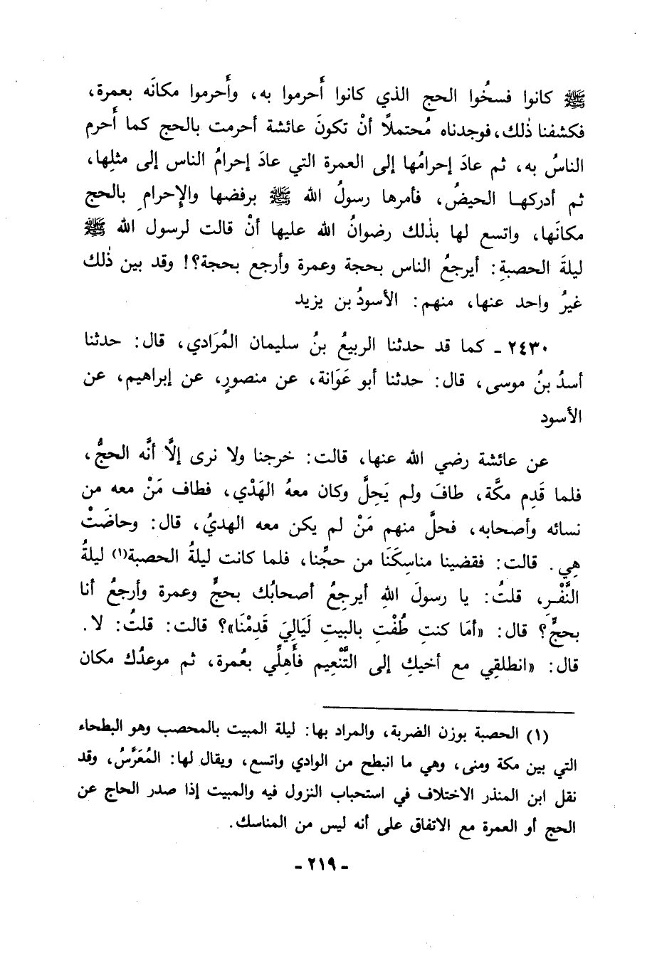 2430 - كَمَا حَدَّثَنَا الرَّبِيعُ بْنُ سُلَيْمَانَ الْمُرَادِيُّ، قَالَ: حَدَّثَنَا أَسَدُ بْنُ مُوسَى، قَالَ: حَدَّثَنَا أَبُو عَوَانَةَ، عَنْ مَنْصُورٍ، عَنْ إِبْرَاهِيمَ، عَنِ الْأَسْوَدِ، عَنْ عَائِشَةَ رَضِيَ اللهُ عَنْهَا قَالَتْ: خَرَجْنَا وَلَا نَرَى إِلَّا أَنَّهُ الْحَجُّ، فَلَمَّا قَدِمَ مَكَّةَ طَافَ وَلَمْ يَحِلَّ وَكَانَ مَعَهُ الْهَدْيُ، فَطَافَ مَنْ مَعَهُ مِنْ نِسَائِهِ وَأَصْحَابِهِ، فَحَلَّ مِنْهُمْ مَنْ لَمْ يَكُنْ مَعَهُ الْهَدْيُ. قَالَ: وَحَاضَتْ هِيَ، قَالَتْ: فَقَضَيْنَا مَنَاسِكَنَا مِنْ حَجِّنَا، فَلَمَّا كَانَتْ لَيْلَةُ الْحَصْبَةِ لَيْلَةُ النَّفْرِ قُلْتُ: يَا رَسُولَ اللهِ، أَيَرْجِعُ أَصْحَابُكَ بِحَجٍّ وَعُمْرَةٍ، وَأَرْجِعُ أَنَا بِحَجٍّ؟ قَالَ: " أَمَا كُنْتِ طُفْتِ بِالْبَيْتِ لَيَالِيَ قَدِمْنَا؟ " قَالَتْ: قُلْتُ: لَا. قَالَ: " انْطَلِقِي مَعَ أَخِيكِ إِلَى التَّنْعِيمِ فَأَهِلِّي بِعُمْرَةٍ، ثُمَّ مَوْعِدُكِ مَكَانُ -[220]- كَذَا وَكَذَا ". -[221]- فَفِي هَذَا الْحَدِيثِ مَا قَدْ دَلَّ عَلَى أَنَّهَا قَدْ كَانَتْ خَرَجَتْ مِنْ عُمْرَتِهَا الَّتِي صَارَتْ مَكَانَ حَجَّتِهَا بِتَرْكِهَا الطَّوَافَ لَهَا حَتَّى تَشَاغَلَتْ بِمَا تَشَاغَلَتْ بِهِ مِنْ أَمْرِ حَجَّتِهَا. وَقَدْ رَوَى عُرْوَةُ بْنُ الزُّبَيْرِ هَذَا الْحَدِيثَ عَنْ عَائِشَةَ، فَبَيَّنَ فِيهِ مَعْنًى غَيْرَ هَذَا الْمَعْنَى كَانَ هُوَ السَّبَبَ لِخُرُوجِهَا مِنَ الْعُمْرَةِ