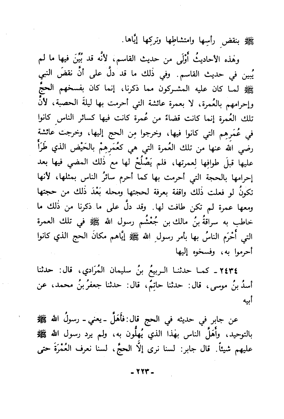 2434 - كَمَا حَدَّثَنَا الرَّبِيعُ بْنُ سُلَيْمَانَ الْمُرَادِيُّ، قَالَ: حَدَّثَنَا أَسَدُ بْنُ مُوسَى، قَالَ: حَدَّثَنَا حَاتِمٌ، قَالَ: حَدَّثَنَا جَعْفَرُ بْنُ مُحَمَّدٍ، عَنْ أَبِيهِ، عَنْ جَابِرٍ فِي حَدِيثِهِ فِي الْحَجِّ قَالَ: فَأَهَلَّ - يَعْنِي رَسُولَ اللهِ صَلَّى اللَّهُ عَلَيْهِ وَسَلَّمَ - بِالتَّوْحِيدِ، وَأَهَلَّ النَّاسُ بِهَذَا الَّذِي يُهِلُّونَ بِهِ، وَلَمْ يَرُدَّ رَسُولُ اللهِ صَلَّى اللَّهُ عَلَيْهِ وَسَلَّمَ عَلَيْهِمْ شَيْئًا. قَالَ جَابِرٌ: لَسْنَا نَرَى إِلَّا الْحَجَّ، لَسْنَا نَعْرِفُ الْعُمْرَةَ، حَتَّى -[224]- إِذَا كُنَّا آخِرَ طَوَافٍ عَلَى الْمَرْوَةِ، قَالَ: " إِنِّي لَوِ اسْتَقْبَلْتُ مِنْ أَمْرِي مَا اسْتَدْبَرْتُ، مَا سُقْتُ الْهَدْيَ وَجَعَلْتُهَا عُمْرَةً، فَمَنْ كَانَ لَيْسَ مَعَهُ هَدْيٌ فَلْيُحْلِلْ وَلْيَجْعَلْهَا عُمْرَةً ". فَحَلَّ النَّاسُ وَقَصَّرُوا إِلَّا النَّبِيَّ صَلَّى اللَّهُ عَلَيْهِ وَسَلَّمَ وَمَنْ كَانَ مَعَهُ الْهَدْيُ، فَقَامَ سُرَاقَةُ بْنُ مَالِكِ بْنِ جُعْشُمٍ، فَقَالَ: يَا رَسُولَ اللهِ، عُمْرَتُنَا هَذِهِ لِعَامِنَا هَذَا أَمْ لِلْأَبَدِ؟ قَالَ: فَشَبَّكَ رَسُولُ اللهِ صَلَّى اللَّهُ عَلَيْهِ وَسَلَّمَ أَصَابِعَهُ فِي الْأُخْرَى، فَقَالَ: " دَخَلَتِ الْعُمْرَةُ هَكَذَا فِي الْحَجِّ "