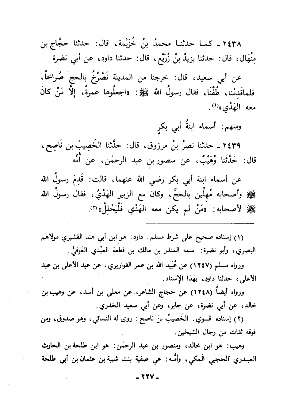 2439 - حَدَّثَنَا نَصْرُ بْنُ مَرْزُوقٍ، قَالَ: حَدَّثَنَا الْخَصِيبُ بْنُ نَاصِحٍ، قَالَ: حَدَّثَنَا وُهَيْبٌ، عَنْ مَنْصُورِ بْنِ عَبْدِ الرَّحْمَنِ، عَنْ أُمِّهِ، عَنْ أَسْمَاءَ ابْنَةِ أَبِي بَكْرٍ رَضِيَ اللهُ عَنْهُمَا قَالَتْ: قَدِمَ رَسُولُ اللهِ صَلَّى اللَّهُ عَلَيْهِ وَسَلَّمَ وَأَصْحَابُهُ مُهِلِّينَ بِالْحَجِّ , وَكَانَ مَعَ الزُّبَيْرِ الْهَدْيُ , فَقَالَ رَسُولُ اللهِ صَلَّى اللَّهُ عَلَيْهِ وَسَلَّمَ لِأَصْحَابِهِ: " مَنْ لَمْ يَكُنْ مَعَهُ الْهَدْيُ فَلْيُحْلِلْ " -[228]- وَفِيمَا ذَكَرْنَا مِنْ هَذَا دَلِيلٌ عَلَى مَا وَصَفْنَا، غَيْرَ أَنَّهُ قَدْ رُوِيَ عَنْ أَنَسِ بْنِ مَالِكٍ أَيْضًا فِي ذَلِكَ مَا يَدْخُلُ فِي الْمَعْنَى الَّذِي أَنْكَرْنَاهُ مِنْ حَدِيثِ خُصَيْفٍ