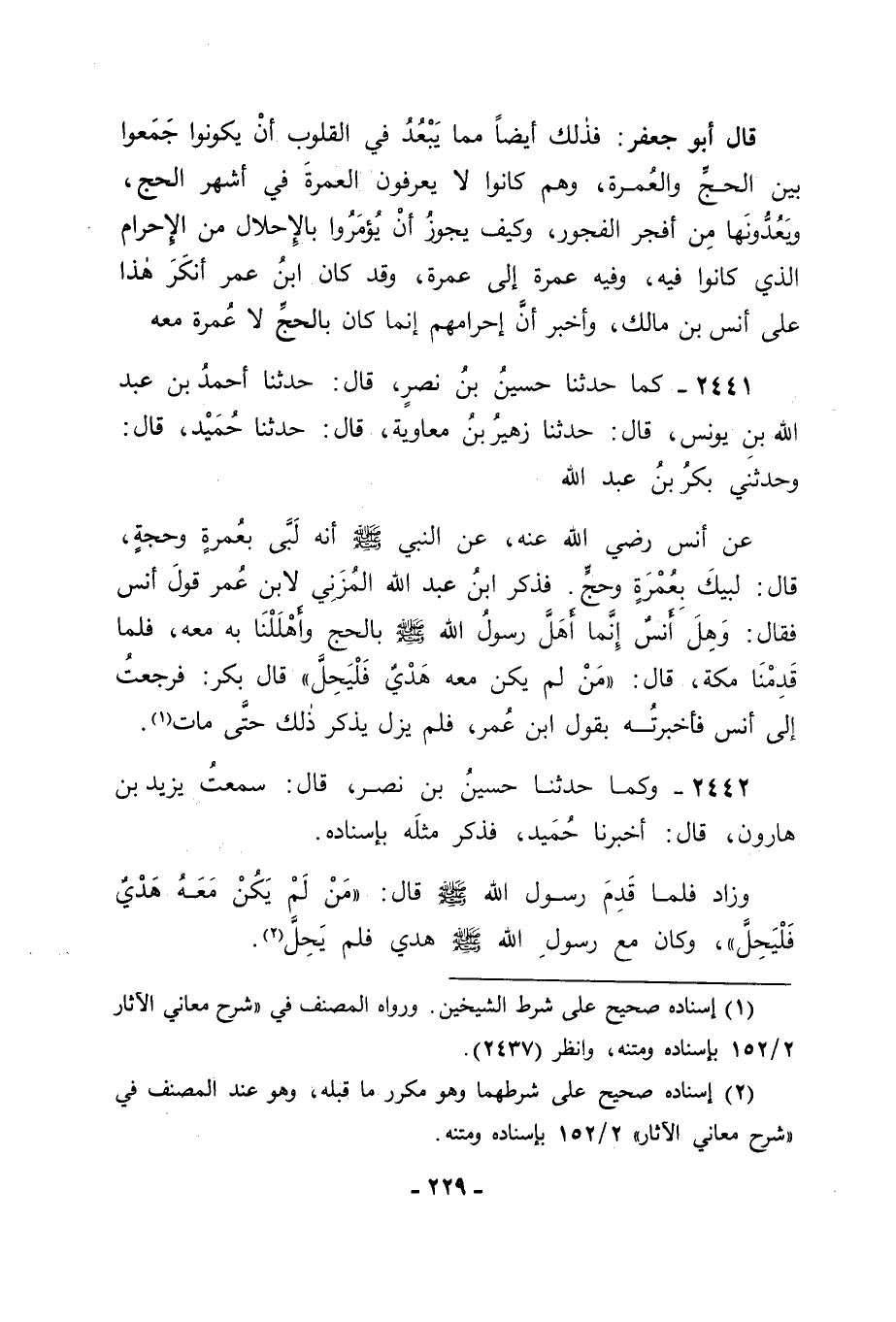 2441 - كَمَا حَدَّثَنَا حُسَيْنُ بْنُ نَصْرٍ، قَالَ: حَدَّثَنَا أَحْمَدُ بْنُ عَبْدِ اللهِ بْنِ يُونُسَ، قَالَ: حَدَّثَنَا زُهَيْرُ بْنُ مُعَاوِيَةَ، قَالَ: حَدَّثَنَا حُمَيْدٌ، قَالَ: وَحَدَّثَنِي بَكْرُ بْنُ عَبْدِ اللهِ، عَنْ أَنَسٍ رَضِيَ اللهُ عَنْهُ , عَنِ النَّبِيِّ صَلَّى اللَّهُ عَلَيْهِ وَسَلَّمَ أَنَّهُ لَبَّى بِعُمْرَةٍ وَحَجَّةٍ , قَالَ: " لَبَّيْكَ بِعُمْرَةٍ وَحَجٍّ. فَذَكَرَ ابْنُ عَبْدِ اللهِ الْمُزَنِيُّ لِابْنِ عُمَرَ قَوْلَ أَنَسٍ، فَقَالَ: وَهِلَ أَنَسٌ، إِنَّمَا أَهَلَّ رَسُولُ اللهِ صَلَّى اللَّهُ عَلَيْهِ وَسَلَّمَ بِالْحَجِّ وَأَهْلَلْنَا بِهِ مَعَهُ، فَلَمَّا قَدِمْنَا مَكَّةَ قَالَ: " مَنْ لَمْ يَكُنْ مَعَهُ هَدْيٌ فَلْيَحْلِلْ ". قَالَ بَكْرٌ فَرَجَعْتُ إِلَى أَنَسٍ فَأَخْبَرْتُهُ بِقَوْلِ ابْنِ عُمَرَ، فَلَمْ يَزَلْ يَذْكُرُ ذَلِكَ حَتَّى مَاتَ