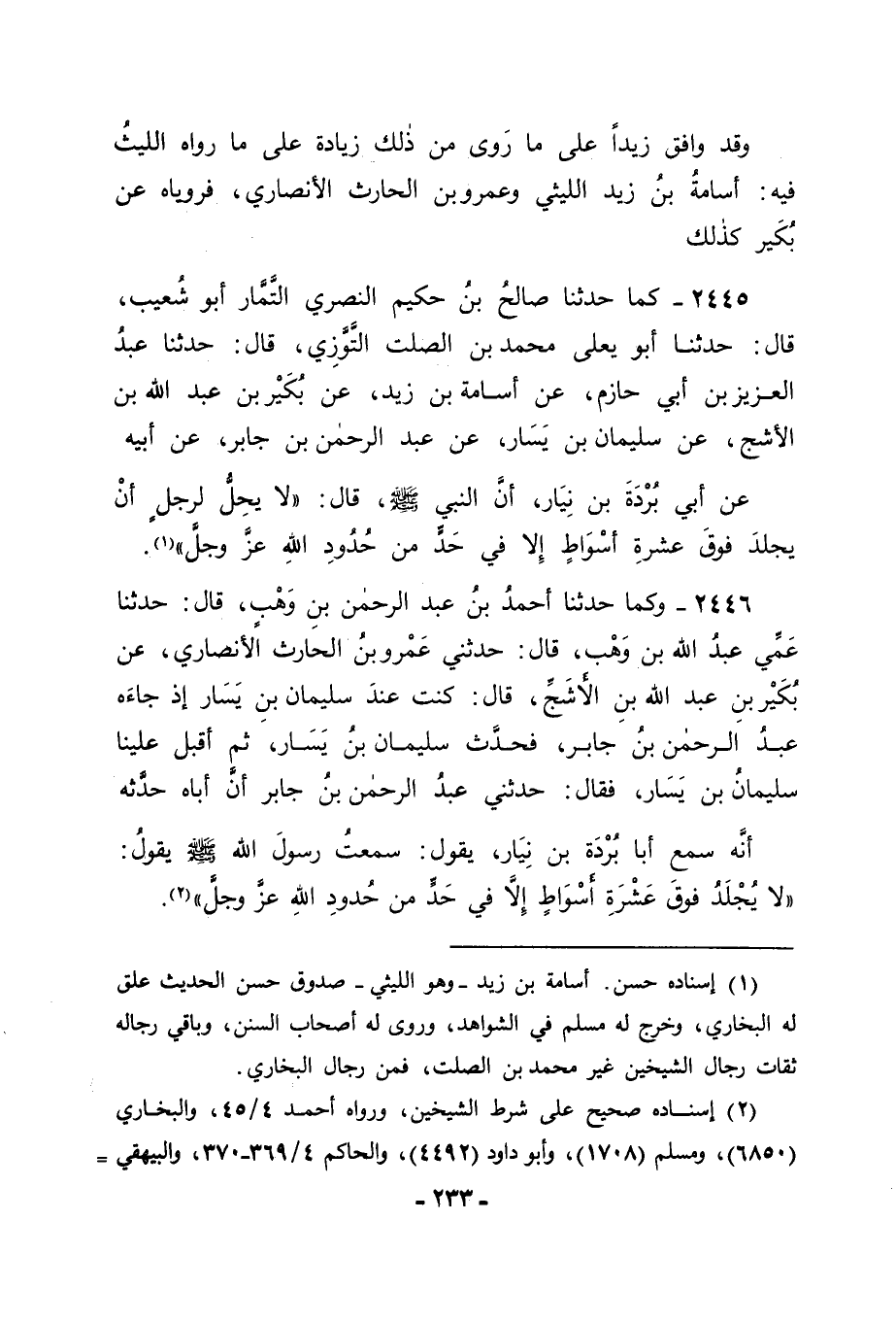2445 - كَمَا حَدَّثَنَا صَالِحُ بْنُ حَكِيمٍ النَّصْرِيُّ التَّمَّارُ أَبُو شُعَيْبٍ، قَالَ: حَدَّثَنَا أَبُو يَعْلَى مُحَمَّدُ بْنُ الصَّلْتِ التَّوَّزِيُّ قَالَ: حَدَّثَنَا عَبْدُ الْعَزِيزِ بْنُ أَبِي حَازِمٍ، عَنْ أُسَامَةَ بْنِ زَيْدٍ، عَنْ بُكَيْرِ بْنِ عَبْدِ اللهِ بْنِ الْأَشَجِّ، عَنْ سُلَيْمَانَ بْنِ يَسَارٍ، عَنْ عَبْدِ الرَّحْمَنِ بْنِ جَابِرٍ، عَنْ أَبِيهِ، عَنْ أَبِي بُرْدَةَ بْنِ نِيَارٍ أَنَّ النَّبِيَّ صَلَّى اللَّهُ عَلَيْهِ وَسَلَّمَ قَالَ: " لَا يَحِلُّ لِرَجُلٍ أَنْ يَجْلِدَ فَوْقَ عَشَرَةِ أَسْوَاطٍ إِلَّا فِي حَدِّ مِنْ حُدُودِ اللهِ عَزَّ وَجَلَّ "