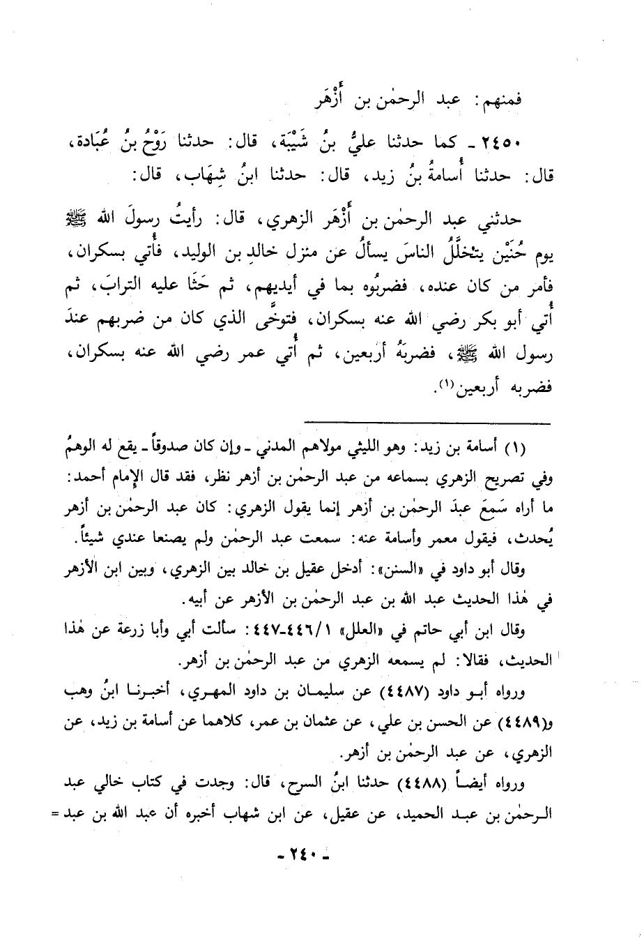2450 - كَمَا حَدَّثَنَا عَلِيُّ بْنُ شَيْبَةَ، قَالَ: حَدَّثَنَا رَوْحُ بْنُ عُبَادَةَ، قَالَ: حَدَّثَنَا أُسَامَةُ بْنُ زَيْدٍ، قَالَ: حَدَّثَنَا ابْنُ شِهَابٍ، قَالَ: حَدَّثَنِي عَبْدُ الرَّحْمَنِ بْنُ أَزْهَرَ الزُّهْرِيُّ، قَالَ: رَأَيْتُ رَسُولَ اللهِ صَلَّى اللَّهُ عَلَيْهِ وَسَلَّمَ يَوْمَ حُنَيْنٍ يَتَخَلَّلُ النَّاسَ يَسْأَلُ عَنْ مَنْزِلِ خَالِدِ بْنِ الْوَلِيدِ، فَأُتِيَ بِسَكْرَانَ، فَأَمَرَ مَنْ كَانَ عِنْدَهُ فَضَرَبُوهُ بِمَا فِي أَيْدِيهِمْ، ثُمَّ حَثَا عَلَيْهِ التُّرَابَ، ثُمَّ أُتِيَ أَبُو بَكْرٍ رَضِيَ اللهُ عَنْهُ بِسَكْرَانَ، فَتَوَخَّى الَّذِي كَانَ مِنْ ضَرْبِهِمْ عِنْدَ رَسُولِ اللهِ صَلَّى اللَّهُ عَلَيْهِ وَسَلَّمَ، فَضَرَبَهُ أَرْبَعِينَ، ثُمَّ أُتِيَ عُمَرُ رَضِيَ اللهُ عَنْهُ بِسَكْرَانَ، فَضَرَبَهُ أَرْبَعِينَ ". -[241]- أَفَلَا تَرَى أَنَّ أَبَا بَكْرٍ رَضِيَ اللهُ عَنْهُ إِنَّمَا كَانَ ضَرَبَ بَعْدَ النَّبِيِّ صَلَّى اللَّهُ عَلَيْهِ وَسَلَّمَ أَرْبَعِينَ فِي ذَلِكَ عَلَى التَّحَرِّي لِضَرْبِ النَّبِيِّ صَلَّى اللَّهُ عَلَيْهِ وَسَلَّمَ الَّذِي كَانَ فِي مِثْلِهِ، لَا لِأَنَّ ذَلِكَ الضَّرْبَ كَانَ مَقْصُودًا بِهِ إِلَى عَدَدٍ مَعْلُومٍ. وَمِنْهُمْ أَبُو سَعِيدٍ الْخُدْرِيُّ