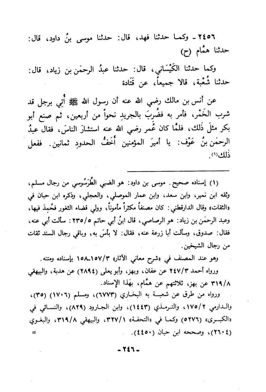 2456 - وَكَمَا حَدَّثَنَا فَهْدٌ، قَالَ: حَدَّثَنَا مُوسَى بْنُ دَاوُدَ، قَالَ: حَدَّثَنَا هَمَّامٌ، (ح) . وَكَمَا حَدَّثَنَا الْكَيْسَانِيُّ، قَالَ: حَدَّثَنَا عَبْدُ الرَّحْمَنِ بْنُ زِيَادٍ، قَالَ: حَدَّثَنَا شُعْبَةُ، قَالَا جَمِيعًا: عَنْ قَتَادَةَ، عَنْ أَنَسِ بْنِ مَالِكٍ رَضِيَ اللهُ عَنْهُ أَنَّ رَسُولَ اللهِ صَلَّى اللَّهُ عَلَيْهِ وَسَلَّمَ أُتِيَ بِرَجُلٍ قَدْ شَرِبَ الْخَمْرَ، فَأَمَرَ بِهِ فَضُرِبَ بِالْجَرِيدِ نَحْوًا مِنْ أَرْبَعِينَ، ثُمَّ صَنَعَ أَبُو بَكْرٍ مِثْلَ ذَلِكَ، فَلَمَّا كَانَ عُمَرُ رَضِيَ اللهُ عَنْهُ اسْتَشَارَ النَّاسَ، فَقَالَ عَبْدُ الرَّحْمَنِ بْنُ عَوْفٍ: " يَا أَمِيرَ الْمُؤْمِنِينَ أَخَفَّ الْحُدُودِ، ثَمَانِينَ ". فَفَعَلَ ذَلِكَ -[247]- قَالَ أَبُو جَعْفَرٍ: أَفَلَا تَرَى إِلَى مَا قَدْ رَوَيْنَاهُ عَنْ عَلِيٍّ مِنْ قَوْلِهِ فِي حَدِّ الْخَمْرِ: إِنَّهُ شَيْءٌ صَنَعْنَاهُ، وَمَا فِي حَدِيثٍ غَيْرِهِ مِنَ التَّحَرِّي الْمَذْكُورِ فِيهِ، وَفِي ذَلِكَ مَا قَدْ دَلَّ أَنَّهُ لَمْ يَكُنْ فِي الْخَمْرِ فِي زَمَنِ النَّبِيِّ صَلَّى اللَّهُ عَلَيْهِ وَسَلَّمَ حَدٌّ مَعْلُومٌ وَلَا مَنْ بَعْدَهُ، حَتَّى كَانَ مِنْ أَصْحَابِهِ رِضْوَانُ اللهِ عَلَيْهِمْ فِي ذَلِكَ مَا كَانَ مِنْهُمْ فِيهِ. وَإِذَا كَانَ الَّذِي قَدْ كَانَ مِنْ رَسُولِ اللهِ صَلَّى اللَّهُ عَلَيْهِ وَسَلَّمَ فِي ذَلِكَ لَمْ يَكُنْ حَدًّا كَانَ تَعْزِيرًا، وَفِيهِ تَجَاوُزُ الْعَشَرَةِ إِلَى مَا فَوْقَهَا مِمَّا ذُكِرَ فِي تِلْكَ الْأَحَادِيثِ , وَفِيهَا عَنْ عَلِيٍّ مَا كَانَ مِنْهُ فِي النَّجَاشِيِّ تَعْزِيرُ الْعِشْرِينَ , وَفِي ذَلِكَ مَا قَدْ تَجَاوَزَ الْعَشَرَةَ، وَفِيمَا ذَكَرْنَا عَنْ رَسُولِ اللهِ صَلَّى اللَّهُ عَلَيْهِ وَسَلَّمَ مَا قَدْ دَلَّ عَلَى أَنَّ لِلْإِمَامِ أَنْ يَتَجَاوَزَ الْعَشَرَةَ فِي التَّعْزِيرِ إِلَى مَا فَوْقَهَا مِمَّا يَجُوزُ أَنْ يَتَجَاوَزَهَا إِلَيْهِ , وَفِي ذَلِكَ مَا قَدْ عَارَضَ حَدِيثَ أَبِي بُرْدَةَ الَّذِي ذَكَرْنَا، وَفِي مُعَارَضَتِهِ إِيَّاهُ مَا قَدْ تَكَافَأَ الْحَدِيثَانِ، إِذْ لَا نَعْلَمُ الْمَنْسُوخَ مِنْهُمَا مِنَ النَّاسِخِ، فَإِذَا تَكَافَآ اتَّسَعَ النَّظَرُ لِلْمُخْتَلِفِينَ فِي ذَلِكَ، وَطُلِبَ الْأَوْلَى مِنْ ذَيْنِكَ الْمَعْنَيَيْنِ، فَوَسِعَهُمْ بِذَلِكَ تَرْكُ حَدِيثِ أَبِي بُرْدَةَ إِلَى خِلَافِهِ مِمَّا قَدْ كَانَ مِنْ رَسُولِ اللهِ صَلَّى اللَّهُ عَلَيْهِ وَسَلَّمَ مِنَ الْعُقُوبَةِ فِي شُرْبِ الْخَمْرِ، بَلْ لَوْ قَالَ قَائِلٌ: إِنَّهُ أَوْلَى مِنْ حَدِيثِ أَبِي بُرْدَةَ؛ لِعَمَلِ أَصْحَابِ رَسُولِ اللهِ صَلَّى اللَّهُ عَلَيْهِ وَسَلَّمَ مِنْ بَعْدِهِ بِهِ، فَكَانَ غَيْرَ مُعَنَّفٍ فِي ذَلِكَ. وَاللهَ عَزَّ وَجَلَّ نَسْأَلُهُ التَّوْفِيقَ
