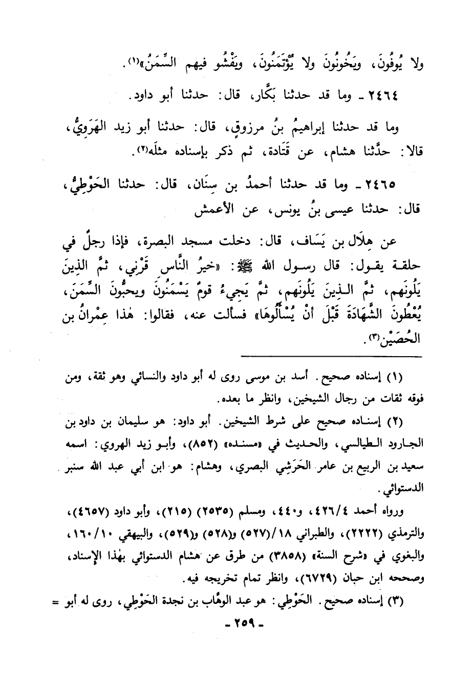 2465 - وَمَا قَدْ حَدَّثَنَا أَحْمَدُ بْنُ سِنَانٍ، قَالَ: حَدَّثَنَا الْحَوْطِيُّ، قَالَ: حَدَّثَنَا عِيسَى بْنُ يُونُسَ، عَنِ الْأَعْمَشِ، عَنْ هِلَالِ بْنِ يَسَافٍ، قَالَ: دَخَلْتُ مَسْجِدَ الْبَصْرَةِ، فَإِذَا رَجُلٌ فِي حَلْقَةٍ يَقُولُ: قَالَ رَسُولُ اللهِ صَلَّى اللَّهُ عَلَيْهِ وَسَلَّمَ: " خَيْرُ النَّاسِ قَرْنِي، ثُمَّ الَّذِينَ يَلُونَهُمْ، ثُمَّ الَّذِينَ يَلُونَهُمْ، ثُمَّ يَجِيءُ قَوْمٌ يَتَسَمَّنُونَ وَيُحِبُّونَ السِّمَنَ، يُعْطُونَ الشَّهَادَةَ قَبْلَ أَنْ يُسْأَلُوهَا ". فَسَأَلْتُ عَنْهُ , فَقَالُوا: هَذَا عِمْرَانُ بْنُ الْحُصَيْنِ