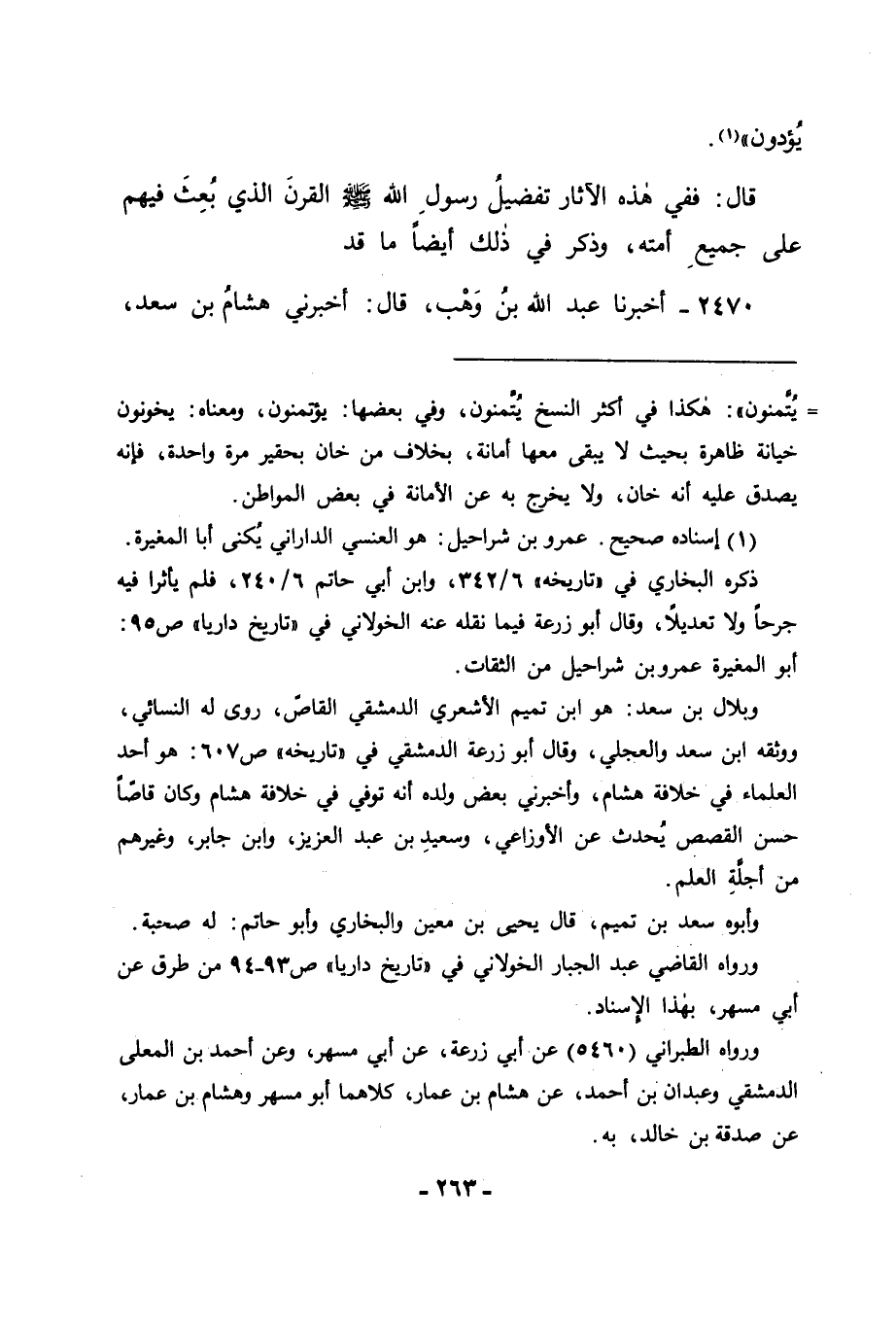 2471 - وَمَا قَدْ حَدَّثَنَا فَهْدٌ، قَالَ: حَدَّثَنَا أَبُو نُعَيْمٍ، قَالَ: حَدَّثَنَا هِشَامُ بْنُ سَعْدٍ، ثُمَّ ذَكَرَ بِإِسْنَادِهِ مِثْلَهُ. فَكَانَ جَوَابُنَا لَهُ فِي ذَلِكَ بِتَوْفِيقِ اللهِ عَزَّ وَجَلَّ وَعَوْنِهِ أَنَّ الَّذِي تَلَاهُ عَلَيْنَا مِنْ كِتَابِ اللهِ عَزَّ وَجَلَّ وَالَّذِي ذَكَرَهُ لَنَا عَنْ رَسُولِ اللهِ صَلَّى اللَّهُ عَلَيْهِ وَسَلَّمَ لَا يَدْفَعَانِ مَا رَوَيْنَا عَنْ رَسُولِ اللهِ صَلَّى اللَّهُ عَلَيْهِ وَسَلَّمَ مِنَ الْحَدِيثِ الَّذِي ذَكَرْنَاهُ فِي صَدْرِ هَذَا الْبَابِ؛ لِأَنَّهُ قَدْ يَجُوزُ أَنْ يَكُونَ رَسُولُ اللهِ صَلَّى اللَّهُ عَلَيْهِ وَسَلَّمَ أَرَادَ بِمَا فِي الْحَدِيثِ الَّذِي رَوَيْنَاهُ فِي صَدْرِ هَذَا الْبَابِ قَوْمًا لَمْ يَأْتُوهُ إِلَى أَنْ قَالَ ذَلِكَ الْقَوْلَ الْمَذْكُورَ فِيهِ قَدْ تَقَدَّمَ إِيمَانُهُمْ وَتَصْدِيقُهُمْ بِهِ رِضْوَانُ اللهِ عَلَيْهِمْ قَبْلَ ذَلِكَ، حَالَ بَيْنَهُمْ وَبَيْنَ إِتْيَانِهِ مَا يَحُولُ بَيْنَهُمْ وَبَيْنَ ذَلِكَ مِنَ الْعَدُوِّ الْمَانِعِ مِنْهُ، وَمِنْ عَدَمِ مَا يَحْمِلُهُمْ إِلَيْهِ وَيُبَلِّغُهُمْ إِيَّاهُ، وَلَمْ يَقْطَعْهُمْ ذَلِكَ عَنِ التَّصْدِيقِ لَهُ وَالْإِيمَانِ بِهِ، ثُمَّ أَتَوْهُ بَعْدَ ذَلِكَ فَلَحِقُوا بِمَنْ تَقَدَّمَهُمْ قَبْلَ ذَلِكَ فِي الْإِتْيَانِ إِلَيْهِ، وَفِي الْقِتَالِ مَعَهُ، وَفِي الْإِنْفَاقِ فِي ذَلِكَ، وَفِي -[266]- التَّصَرُّفِ فِيمَا يَصْرِفُهُمْ فِيهِ، كَمِثْلِ مَا عَلَيْهِ مَنْ كَانَ مَعَهُ قَبْلَ ذَلِكَ، وَكَانَ ذَلِكَ قَبْلَ الْفَتْحِ الَّذِي ذَكَرَهُ اللهُ عَزَّ وَجَلَّ فِي الْآيَةِ الَّتِي تَلَوْنَا، فَتَسَاوَيَا جَمِيعًا فِي هَذِهِ الْأَسْبَابِ غَيْرَ الْإِيمَانِ بِهِ صَلَّى اللَّهُ عَلَيْهِ وَسَلَّمَ وَالتَّصْدِيقِ لَهُ بِظَهْرِ الْغَيْبِ، فَإِنَّهُمْ فَضَلُوا بِذَلِكَ مَنْ آمَنَ بِهِ سِوَاهُمْ مِمَّنْ كَانَ مَعَهُ يَرَى إِقَامَةَ اللهِ عَزَّ وَجَلَّ الْحُجَجَ الَّتِي لَا يَتَهَيَّأُ مَعَهَا لِذَوِي الْأَفْهَامِ الرَّدُّ لَهَا وَلَا الْخُرُوجُ عَنْهَا، فَهَذَا مَعْنًى يَحْتَمِلُهُ الْحَدِيثُ الَّذِي رَوَيْنَاهُ فِي أَوَّلِ هَذَا الْبَابِ مِمَّا لَا يَخْرُجُ مِنَ الْآيَةِ الَّتِي تَلَاهَا هَذَا الْقَائِلُ عَلَيْنَا، وَلَا مِنَ الْآثَارِ الَّتِي ذَكَرَهَا لَنَا عَنْ رَسُولِ اللهِ صَلَّى اللَّهُ عَلَيْهِ وَسَلَّمَ، وَاللهُ أَعْلَمُ بِحَقِيقَةِ الْأَمْرِ فِي ذَلِكَ، غَيْرَ أَنَّ هَذَا مَا بَلَغَهُ فَهْمُنَا مِنْهُ. وَاللهَ نَسْأَلُهُ التَّوْفِيقَ