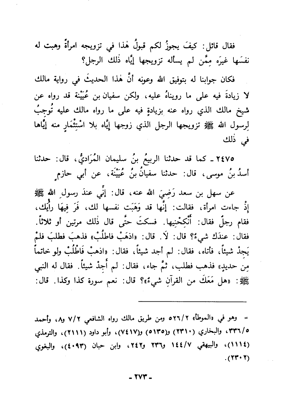 2475 - كَمَا قَدْ حَدَّثَنَا الرَّبِيعُ بْنُ سُلَيْمَانَ الْمُرَادِيُّ، قَالَ: حَدَّثَنَا أَسَدُ بْنُ مُوسَى، قَالَ: حَدَّثَنَا سُفْيَانُ بْنُ عُيَيْنَةَ، عَنْ أَبِي حَازِمٍ، عَنْ سَهْلِ بْنِ سَعْدٍ رَضِيَ اللهُ عَنْهُ قَالَ: إِنِّي عِنْدَ رَسُولِ اللهِ صَلَّى اللَّهُ عَلَيْهِ وَسَلَّمَ إِذْ جَاءَتِ امْرَأَةٌ، فَقَالَتْ: إِنَّهَا قَدْ وَهَبَتْ نَفْسَهَا لَكَ، فَرَ فِيهَا رَأْيَكَ، فَقَامَ رَجُلٌ فَقَالَ: أَنْكِحْنِيهَا، فَسَكَتَ، حَتَّى قَالَ ذَلِكَ مَرَّتَيْنِ أَوْ ثَلَاثًا، فَقَالَ: " عِنْدَكَ شَيْءٌ؟ قَالَ: لَا. قَالَ: " اذْهَبْ فَاطْلُبْ ". فَذَهَبَ فَطَلَبَ، فَلَمْ يَجِدْ شَيْئًا، فَأَتَاهُ فَقَالَ: لَمْ أَجِدْ شَيْئًا. فَقَالَ: " اذْهَبْ فَاطْلُبْ وَلَوْ خَاتَمًا مِنْ حَدِيدٍ ". فَذَهَبَ فَطَلَبَ، ثُمَّ جَاءَ فَقَالَ: لَمْ أَجِدْ شَيْئًا. فَقَالَ لَهُ النَّبِيُّ صَلَّى اللَّهُ عَلَيْهِ وَسَلَّمَ: " هَلْ مَعَكَ مِنَ الْقُرْآنِ شَيْءٌ؟ " قَالَ: نَعَمْ، سُورَةُ كَذَا وَكَذَا. قَالَ: " -[274]- اذْهَبْ فَقَدْ أَنْكَحْتُكَ مَعَ مَا مَعَكَ مِنَ الْقُرْآنِ "