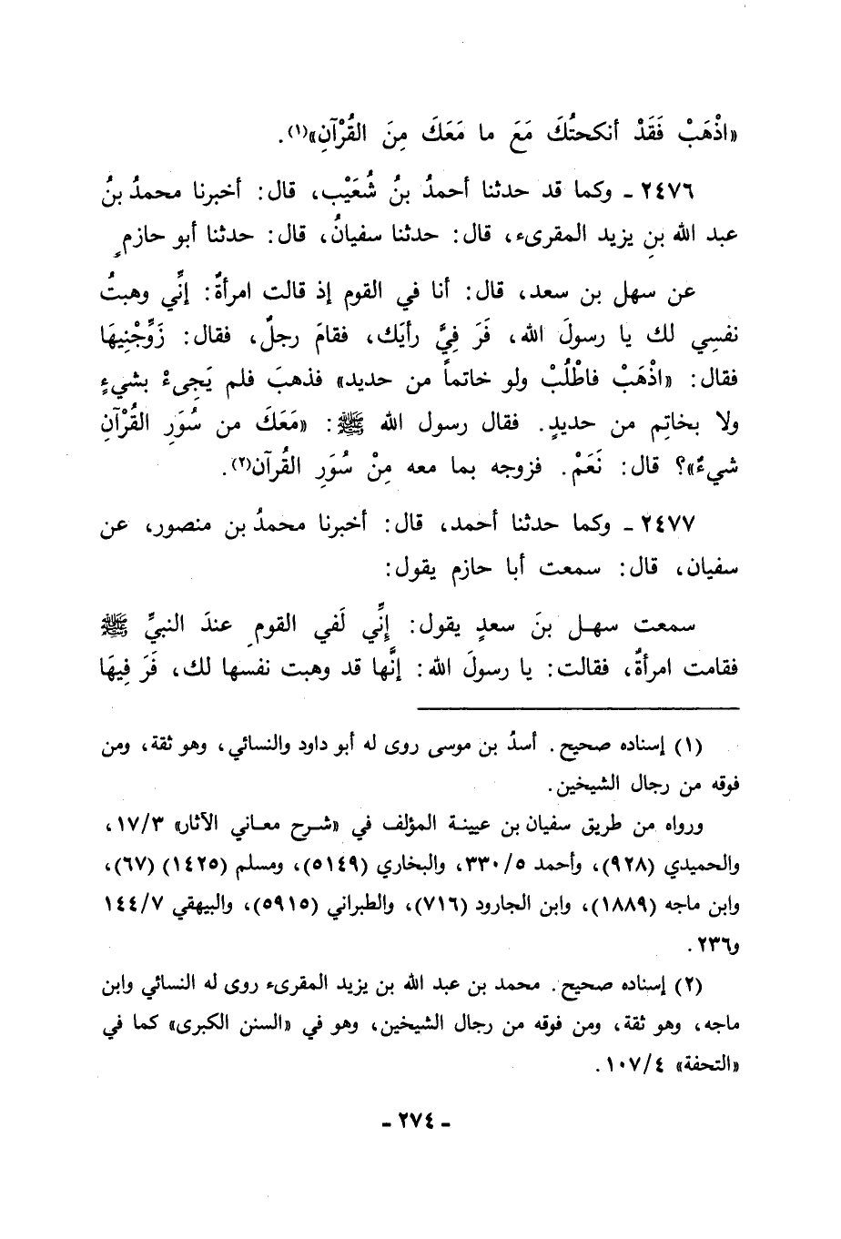 2476 - وَكَمَا قَدْ حَدَّثَنَا أَحْمَدُ بْنُ شُعَيْبٍ، قَالَ: حَدَّثَنَا مُحَمَّدُ بْنُ عَبْدِ اللهِ بْنِ يَزِيدَ الْمُقْرِئُ، قَالَ: حَدَّثَنَا سُفْيَانُ، قَالَ: حَدَّثَنَا أَبُو حَازِمٍ، عَنْ سَهْلِ بْنِ سَعْدٍ، قَالَ: إِنَّا فِي الْقَوْمِ إِذْ قَالَتِ امْرَأَةٌ: إِنِّي وَهَبْتُ نَفْسِي لَكَ يَا رَسُولَ اللهِ، فَرَ فِيَّ رَأْيَكَ. فَقَامَ رَجُلٌ فَقَالَ: زَوِّجْنِيهَا. فَقَالَ: " اذْهَبْ فَاطْلُبْ وَلَوْ خَاتَمًا مِنْ حَدِيدٍ ". فَذَهَبَ فَلَمْ يَجِئْ بِشَيْءٍ وَلَا بِخَاتَمٍ مِنْ حَدِيدٍ، فَقَالَ رَسُولُ اللهِ صَلَّى اللَّهُ عَلَيْهِ وَسَلَّمَ: " مَعَكَ مِنْ سُوَرِ الْقُرْآنِ شَيْءٌ؟ " قَالَ: نَعَمْ. فَزَوَّجَهُ بِمَا مَعَهُ مِنْ سُوَرِ الْقُرْآنِ ".
