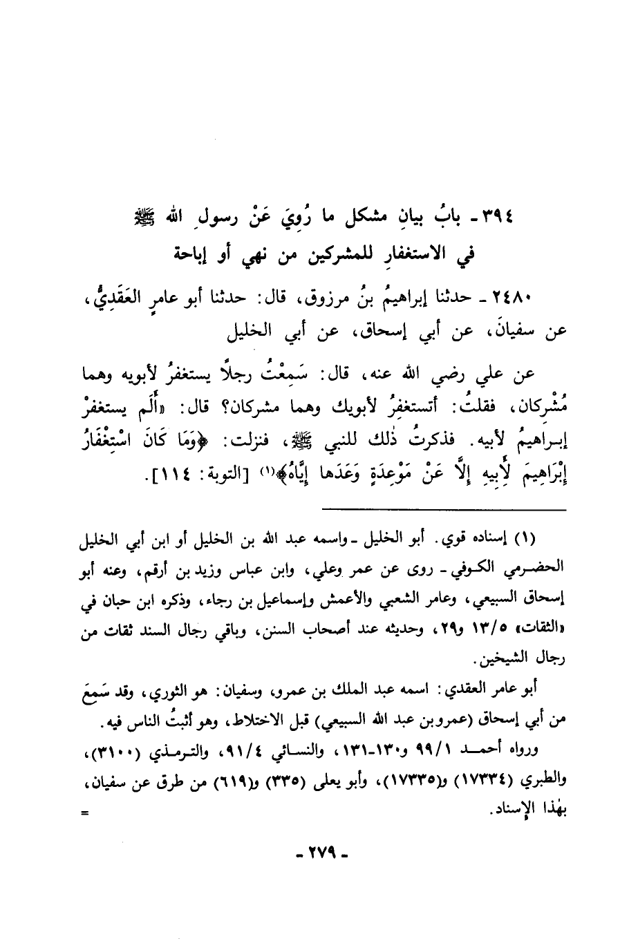 2480 - حَدَّثَنَا إِبْرَاهِيمُ بْنُ مَرْزُوقٍ، قَالَ: حَدَّثَنَا أَبُو عَامِرٍ الْعَقَدِيُّ، عَنْ سُفْيَانَ، عَنْ أَبِي إِسْحَاقَ، عَنْ أَبِي الْخَلِيلِ، عَنْ عَلِيٍّ رَضِيَ اللهُ عَنْهُ قَالَ: سَمِعْتُ رَجُلًا يَسْتَغْفِرُ لِأَبَوَيْهِ وَهُمَا مُشْرِكَانِ، فَقُلْتُ: أَتَسْتَغْفِرُ لِأَبَوَيْكَ وَهُمَا مُشْرِكَانِ؟ قَالَ: أَلَمْ يَسْتَغْفِرْ إِبْرَاهِيمُ لِأَبِيهِ؟ فَذَكَرْتُ ذَلِكَ لِلنَّبِيِّ صَلَّى اللَّهُ عَلَيْهِ وَسَلَّمَ، فَنَزَلَتْ: {وَمَا كَانَ اسْتِغْفَارُ إِبْرَاهِيمَ لِأَبِيهِ إِلَّا عَنْ مَوْعِدَةٍ وَعَدَهَا إِيَّاهُ} [التوبة: 114] . -[280]-