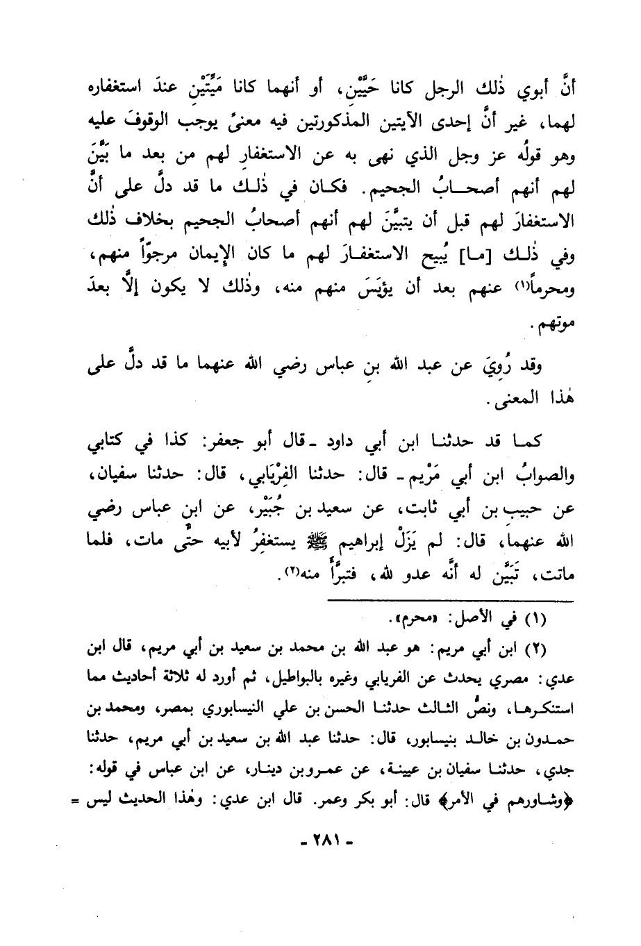 كَمَا قَدْ حَدَّثَنَا ابْنُ أَبِي دَاوُدَ قَالَ أَبُو جَعْفَرٍ: كَذَا فِي كِتَابِي، وَالصَّوَابُ ابْنُ أَبِي مَرْيَمَ قَالَ: حَدَّثَنَا الْفِرْيَابِيُّ قَالَ: حَدَّثَنَا سُفْيَانُ، عَنْ حَبِيبِ بْنِ أَبِي ثَابِتٍ، عَنْ سَعِيدِ بْنِ جُبَيْرٍ، عَنِ ابْنِ عَبَّاسٍ رَضِيَ اللهُ عَنْهُمَا قَالَ: " لَمْ يَزَلْ إِبْرَاهِيمُ صَلَّى اللَّهُ عَلَيْهِ وَسَلَّمَ يَسْتَغْفِرُ لِأَبِيهِ حَتَّى مَاتَ، فَلَمَّا مَاتَ تَبَيَّنَ لَهُ أَنَّهُ عَدُوٌّ لِلَّهِ فَتَبَرَّأَ مِنْهُ "