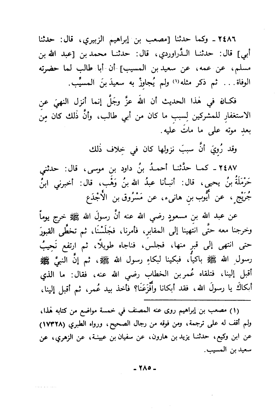 2487 - كَمَا حَدَّثَنَا أَحْمَدُ بْنُ دَاوُدَ بْنِ مُوسَى، قَالَ: حَدَّثَنِي حَرْمَلَةُ بْنُ يَحْيَى قَالَ: أَنْبَأَنَا عَبْدُ اللهِ بْنُ وَهْبٍ، قَالَ: أَخْبَرَنِي ابْنُ جُرَيْجٍ، عَنْ أَيُّوبَ بْنِ هَانِئٍ، عَنْ مَسْرُوقِ بْنِ الْأَجْدَعِ، عَنْ عَبْدِ اللهِ بْنِ مَسْعُودٍ رَضِيَ اللهُ عَنْهُ أَنَّ رَسُولَ اللهِ صَلَّى اللَّهُ عَلَيْهِ وَسَلَّمَ خَرَجَ يَوْمًا وَخَرَجْنَا مَعَهُ حَتَّى انْتَهَيْنَا إِلَى الْمَقَابِرِ، فَأَمَرَنَا فَجَلَسْنَا، ثُمَّ تَخَطَّى الْقُبُورَ حَتَّى انْتَهَى إِلَى قَبْرٍ مِنْهَا، فَجَلَسَ فَنَاجَاهُ طَوِيلًا، ثُمَّ ارْتَفَعَ نَحِيبُ رَسُولِ اللهِ صَلَّى اللَّهُ عَلَيْهِ وَسَلَّمَ بَاكِيًا، فَبَكَيْنَا لِبُكَاءِ رَسُولِ اللهِ صَلَّى اللَّهُ عَلَيْهِ وَسَلَّمَ، ثُمَّ إِنَّ النَّبِيَّ صَلَّى اللَّهُ عَلَيْهِ وَسَلَّمَ أَقْبَلَ إِلَيْنَا، فَتَلَقَّاهُ عُمَرُ بْنُ الْخَطَّابِ رَضِيَ اللهُ عَنْهُ، فَقَالَ: مَا الَّذِي أَبْكَاكَ يَا رَسُولَ اللهِ، فَقَدْ أَبْكَانَا وَأَفْزَعَنَا؟ فَأَخَذَ بِيَدِ عُمَرَ , ثُمَّ أَقْبَلَ إِلَيْنَا -[286]- فَأَتَيْنَاهُ , فَقَالَ: " أَفْزَعَكُمْ بُكَائِي؟ " قُلْنَا: نَعَمْ يَا رَسُولَ اللهِ. فَقَالَ: " إِنَّ الْقَبْرَ الَّذِي رَأَيْتُمُونِي أُنَاجِي قَبْرُ آمِنَةَ بِنْتِ وَهْبٍ، وَإِنِّي اسْتَأْذَنْتُ رَبِّي عَزَّ وَجَلَّ فِي الِاسْتِغْفَارِ لَهَا فَلَمْ يَأْذَنْ لِي، وَنَزَلَ عَلَيَّ: {مَا كَانَ لِلنَّبِيِّ وَالَّذِينَ آمَنُوا أَنْ يَسْتَغْفِرُوا لِلْمُشْرِكِينَ} [التوبة: 113] حَتَّى تَنْقَضِيَ الْآيَةُ، {وَمَا كَانَ اسْتِغْفَارُ إِبْرَاهِيمَ لِأَبِيهِ} [التوبة: 114] ، فَأَخَذَنِي مَا يَأْخُذُ الْوَلَدَ لِلْوَالِدَيْنِ مِنَ الرِّقَّةِ، فَذَلِكَ الَّذِي أَبْكَانِي ". فَاللهُ أَعْلَمُ بِالسَّبَبِ الَّذِي كَانَ فِيهِ نُزُولُ مَا قَدْ تَلَوْنَا، غَيْرَ أَنَّهُ قَدْ يَجُوزُ أَنْ يَكُونَ نُزُولُ مَا قَدْ تَلَوْنَا بَعْدَ أَنْ كَانَ جَمِيعُ مَا ذَكَرْنَا مِنْ سَبَبِ أَبِي طَالِبٍ، وَمِنْ سَبَبِ عَلِيٍّ رَضِيَ اللهُ عَنْهُ فِيمَا كَانَ سَمِعَهُ مِنَ الْمُسْتَغْفِرِ لِأَبَوَيْهِ، وَمِنْ زِيَارَةِ النَّبِيِّ صَلَّى اللَّهُ عَلَيْهِ وَسَلَّمَ قَبْرَ أُمِّهِ , وَمِنْ سُؤَالِ رَبِّهِ عَزَّ وَجَلَّ عِنْدَ ذَلِكَ الْإِذْنَ لَهُ فِي الِاسْتِغْفَارِ لَهَا، فَكَانَ نُزُولُ مَا تَلَوْنَا جَوَابًا عَنْ ذَلِكَ كُلِّهِ. وَقَدْ رُوِيَ عَنْهُ صَلَّى اللَّهُ عَلَيْهِ وَسَلَّمَ فِي إِبَاحَةِ الِاسْتِغْفَارِ لِأَحْيَائِهِمْ