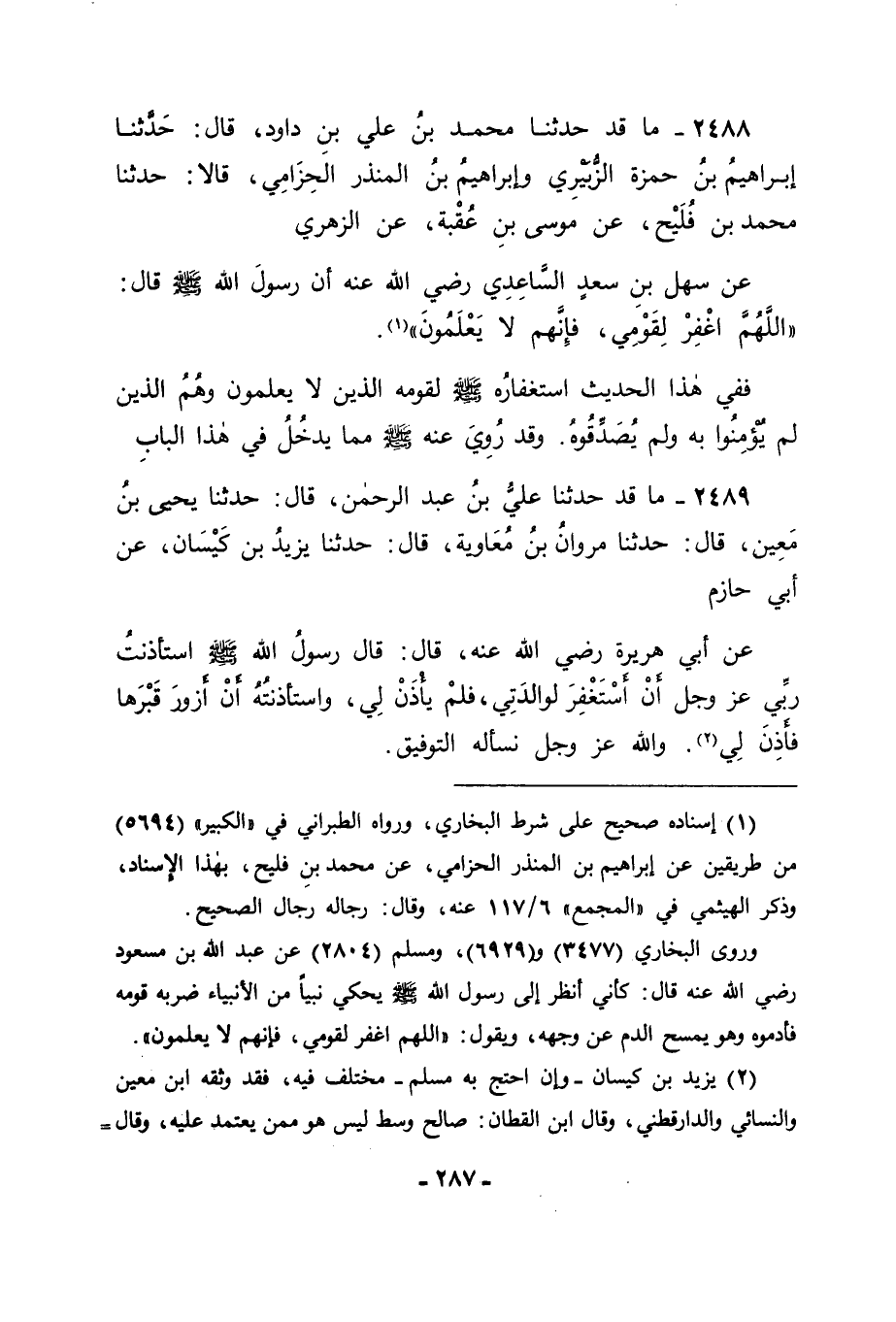 2488 - مَا قَدْ حَدَّثَنَا مُحَمَّدُ بْنُ عَلِيِّ بْنِ دَاوُدَ قَالَ: حَدَّثَنَا إِبْرَاهِيمُ بْنُ حَمْزَةَ الزُّبَيْرِيُّ، وَإِبْرَاهِيمُ بْنُ الْمُنْذِرِ الْحِزَامِيُّ قَالَا: حَدَّثَنَا مُحَمَّدُ بْنُ فُلَيْحٍ، عَنْ مُوسَى بْنِ عُقْبَةَ، عَنِ الزُّهْرِيِّ، عَنْ سَهْلِ بْنِ سَعْدٍ السَّاعِدِيِّ رَضِيَ اللهُ عَنْهُ أَنَّ رَسُولَ اللهِ صَلَّى اللَّهُ عَلَيْهِ وَسَلَّمَ قَالَ: " اللهُمَّ اغْفِرْ لِقَوْمِي فَإِنَّهُمْ لَا يَعْلَمُونَ ". فَفِي هَذَا الْحَدِيثِ اسْتِغْفَارُهُ صَلَّى اللَّهُ عَلَيْهِ وَسَلَّمَ لِقَوْمِهِ الَّذِينَ لَا يَعْلَمُونَ، وَهُمُ الَّذِينَ لَمْ يُؤْمِنُوا بِهِ وَلَمْ يُصَدِّقُوهُ. وَقَدْ رُوِيَ عَنْهُ صَلَّى اللَّهُ عَلَيْهِ وَسَلَّمَ مِمَّا يَدْخُلُ فِي هَذَا الْبَابِ