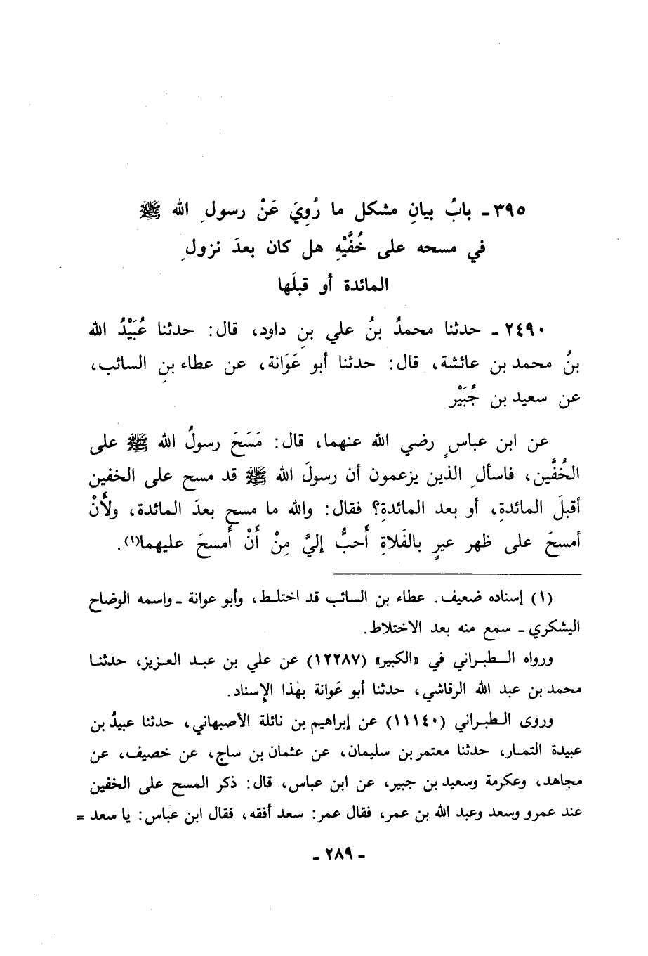 2490 - حَدَّثَنَا مُحَمَّدُ بْنُ عَلِيِّ بْنِ دَاوُدَ، قَالَ: حَدَّثَنَا عُبَيْدُ اللهِ بْنُ مُحَمَّدِ بْنِ عَائِشَةَ، قَالَ: حَدَّثَنَا أَبُو عَوَانَةَ، عَنْ عَطَاءِ بْنِ السَّائِبِ، عَنْ سَعِيدِ بْنِ جُبَيْرٍ، عَنِ ابْنِ عَبَّاسٍ رَضِيَ اللهُ عَنْهُمَا قَالَ: " مَسَحَ رَسُولُ اللهِ صَلَّى اللَّهُ عَلَيْهِ وَسَلَّمَ عَلَى الْخُفَّيْنِ، فَاسْأَلِ الَّذِينَ يَزْعُمُونَ أَنَّ رَسُولَ اللهِ صَلَّى اللَّهُ عَلَيْهِ وَسَلَّمَ قَدْ مَسَحَ عَلَى الْخُفَّيْنِ أَقَبْلَ الْمَائِدَةِ أَوْ بَعْدَ الْمَائِدَةِ؟ فَقَالَ: وَاللهِ مَا مَسَحَ بَعْدَ الْمَائِدَةِ , وَلَأَنْ أَمْسَحَ عَلَى ظَهْرِ عِيرٍ بِالْفَلَاةِ أَحَبُّ إِلَيَّ مِنْ أَنْ أَمْسَحَ عَلَيْهِمَا ". -[290]- فَفِي هَذَا الْحَدِيثِ أَنَّ مَسْحَ رَسُولِ اللهِ صَلَّى اللَّهُ عَلَيْهِ وَسَلَّمَ عَلَى خُفَّيْهِ كَانَ قَبْلَ نُزُولِ الْمَائِدَةِ، وَأَنَّهُ لَمْ يَمْسَحْ عَلَيْهِمَا بَعْدَ نُزُولِهَا عَلَيْهِ، وَفِيهِ مِنْ قَوْلِ ابْنِ عَبَّاسٍ: " وَلَأَنْ أَمْسَحَ عَلَى ظَهْرِ عِيرٍ بِالْفَلَاةِ أَحَبُّ إِلَيَّ مِنْ أَنْ أَمْسَحَ عَلَيْهِمَا "، فَتَعَلَّقَ بِهَذَا الْحَدِيثِ قَوْمٌ، فَمَنَعُوا بِهِ مِنَ الْمَسْحِ عَلَى الْخُفَّيْنِ. فَتَأَمَّلْنَا هَذَا الْحَدِيثَ هَلْ يُوجِبُ مَا حَمَلُوهُ عَلَيْهِ أَمْ لَا؟ فَوَجَدْنَا فِيهِ أَنَّ رَسُولَ اللهِ صَلَّى اللَّهُ عَلَيْهِ وَسَلَّمَ قَدْ كَانَ مَسَحَ عَلَى الْخُفَّيْنِ قَبْلَ نُزُولِ الْمَائِدَةِ عَلَيْهِ، وَلَيْسَ فِيهِ أَنَّهُ قَالَ لِلنَّاسِ بَعْدَ نُزُولِهَا عَلَيْهِ: لَا تَمْسَحُوا عَلَيْهِمَا فَإِنَّ الَّذِي نَزَلَ عَلَيَّ فِي سُورَةِ الْمَائِدَةِ مِنْ غَسْلِ الرِّجْلَيْنِ فِي الْوُضُوءِ لِلصَّلَاةِ قَدْ مَنَعَ مِنْ ذَلِكَ. وَلَوْ كَانَ ذَلِكَ كَذَلِكَ لَكَانَتِ الْحُجَّةُ قَدْ قَامَتْ بِنَسْخِ الْمَسْحِ عَلَى الْخُفَّيْنِ فِي الْوُضُوءِ، وَإِنَّمَا فِيهِ قَوْلُ ابْنِ -[291]- عَبَّاسٍ أَنَّهُ لَمْ يَمْسَحْ عَلَيْهِمَا بَعْدَ نُزُولِ الْمَائِدَةِ، وَقَدْ يَجُوزُ أَنْ يَكُونَ كَانَ ذَلِكَ؛ لِأَنَّهُ لَمْ يَرَ رَسُولَ اللهِ صَلَّى اللَّهُ عَلَيْهِ وَسَلَّمَ مَسَحَ عَلَيْهِمَا , وَرَآهُ غَيْرُهُ مَسَحَ عَلَيْهِمَا، فَإِنْ كَانَ ذَلِكَ كَذَلِكَ , كَانَ مَنْ رَآهُ مَسَحَ عَلَيْهِمَا بَعْدَ نُزُولِهَا أَوْلَى بِمَا رُوِيَ مِمَّنْ رَوَى أَنَّهُ لَمْ يَرَهُ مَسَحَ عَلَيْهِمَا بَعْدَ نُزُولِهَا. وَتَأَمَّلْنَا قَوْلَ ابْنِ عَبَّاسٍ: " وَلَأَنْ أَمْسَحَ عَلَى ظَهْرِ عِيرٍ بِالْفَلَاةِ أَحَبُّ إِلَيَّ مِنْ أَنْ أَمْسَحَ عَلَيْهِمَا "، فَوَجَدْنَاهُ مُحْتَمِلًا أَنْ يَكُونَ ذَلِكَ مِنْهُ؛ لِأَنَّهُ مِنْ قَوْمٍ قَدِ اخْتَصَّهُمْ رَسُولُ اللهِ صَلَّى اللَّهُ عَلَيْهِ وَسَلَّمَ دُونَ النَّاسِ بِإِسْبَاغِ الْوُضُوءِ عَلَى مَا رَوَيْنَاهُ فِيهِمْ مِمَّا قَدْ تَقَدَّمَ فِي كِتَابِنَا هَذَا، وَهُوَ قَوْلُ ابْنِ عَبَّاسٍ: مَا اخْتَصَّنَا رَسُولُ اللهِ صَلَّى اللَّهُ عَلَيْهِ وَسَلَّمَ دُونَ النَّاسِ إِلَّا بِثَلَاثَةٍ: إِسْبَاغِ الْوُضُوءِ، وَأَنْ لَا نَأْكُلَ الصَّدَقَةَ، وَأَنْ لَا نُنْزِيَ حِمَارًا عَلَى فَرَسٍ. وَكَانَ إِسْبَاغُ الْوُضُوءِ هُوَ الْمُبَالَغَةَ فِيهِ، وَتَبْلِيغَهُ أَعْلَى مَرَاتِبِهِ، وَفِي ذَلِكَ غَسْلُ الْقَدَمَيْنِ لَا الْمَسْحُ عَلَى الْخُفَّيْنِ الْمَلْبُوسَيْنِ عَلَيْهِمَا , وَيَكُونُ الْمَسْحُ عَلَى الْخُفَّيْنِ عِنْدَهُ لِغَيْرِهِ مِنَ النَّاسِ بَاقِيًا عَلَى حُكْمِهِ قَبْلَ نُزُولِ الْمَائِدَةِ , وَيَكُونُ لَهُ مَعَ ذَلِكَ أَنْ يَمْسَحَ عَلَى الْخُفَّيْنِ كَمَا يَمْسَحُ غَيْرُهُ مِنَ النَّاسِ، وَإِنْ كَانَ لُزُومُ مَا اخْتَصَّهُ بِهِ رَسُولُ اللهِ صَلَّى اللَّهُ عَ