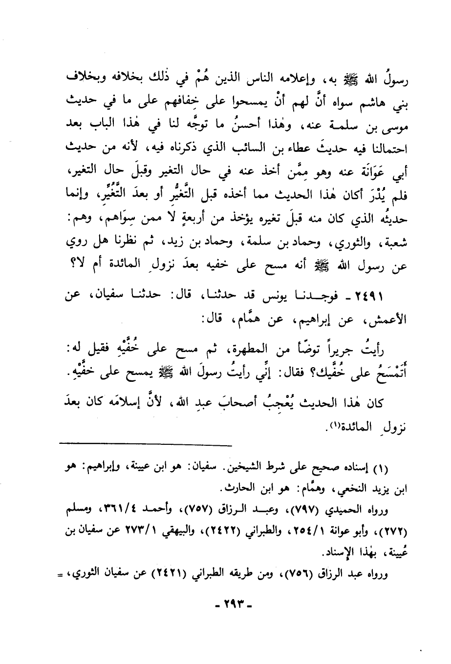 2491 - فَوَجَدْنَا يُونُسَ قَدْ حَدَّثَنَا قَالَ: حَدَّثَنَا سُفْيَانُ، عَنِ الْأَعْمَشِ، عَنْ إِبْرَاهِيمَ، عَنْ هَمَّامٍ، قَالَ: رَأَيْتُ جَرِيرًا تَوَضَّأَ مِنَ الْمَطْهَرَةِ، ثُمَّ مَسَحَ عَلَى خُفَّيْهِ، فَقِيلَ لَهُ: أَتَمْسَحُ عَلَى خُفَّيْكَ؟ فَقَالَ: إِنِّي رَأَيْتُ رَسُولَ اللهِ صَلَّى اللَّهُ عَلَيْهِ وَسَلَّمَ يَمْسَحُ عَلَى خُفَّيْهِ ". كَانَ هَذَا الْحَدِيثُ يُعْجِبُ أَصْحَابَ عَبْدِ اللهِ؛ لِأَنَّ إِسْلَامَهُ كَانَ بَعْدَ نُزُولِ الْمَائِدَةِ