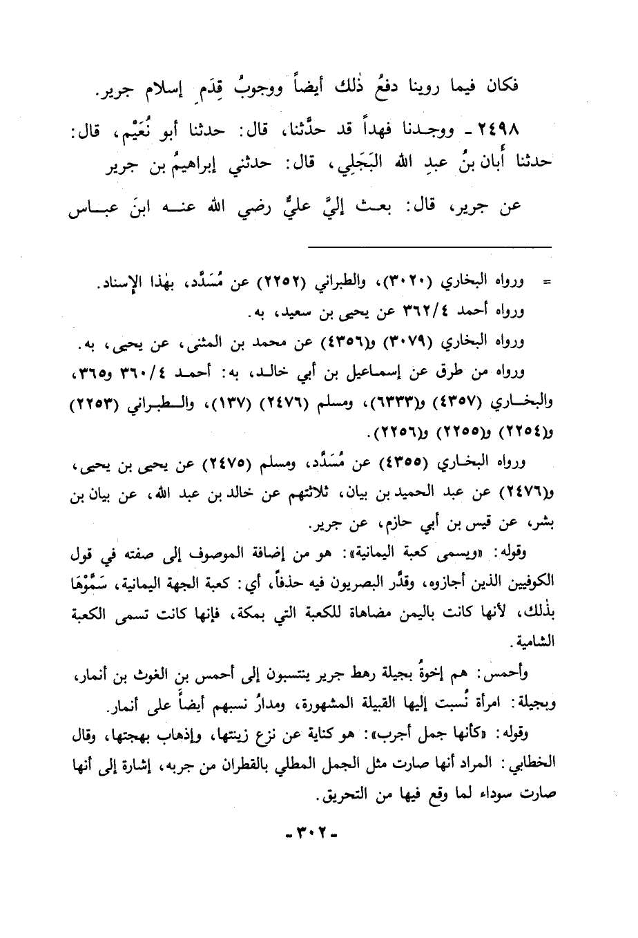 2498 - وَوَجَدْنَا فَهْدًا قَدْ حَدَّثَنَا قَالَ: حَدَّثَنَا أَبُو نُعَيْمٍ، قَالَ: حَدَّثَنَا أَبَانُ بْنُ عَبْدِ اللهِ الْبَجَلِيُّ، قَالَ: حَدَّثَنِي إِبْرَاهِيمُ بْنُ جَرِيرٍ، عَنْ جَرِيرٍ، قَالَ: " بَعَثَ إِلَيَّ عَلِيٌّ رَضِيَ اللهُ عَنْهُ ابْنَ عَبَّاسٍ -[303]- وَالْأَشْعَثَ بْنَ قَيْسٍ، فَأَتَيَانِي وَأَنَا بِقَرْقِيسِيَةَ، فَقَالَا: إِنَّ أَمِيرَ الْمُؤْمِنِينَ يُقْرِئُكَ السَّلَامَ، وَيُخْبِرُكَ أَنَّهُ نِعْمَ مَا أَرَاكَ اللهُ مِنْ مُفَارَقَتِكَ، فَأْتِنِي أُنْزِلْكَ مَنْزِلَةَ رَسُولِ اللهِ صَلَّى اللَّهُ عَلَيْهِ وَسَلَّمَ الَّتِي أَنْزَلَكَهَا. فَقَالَ لَهُمَا جَرِيرٌ: إِنَّ نَبِيَّ اللهِ صَلَّى اللَّهُ عَلَيْهِ وَسَلَّمَ بَعَثَنِي إِلَى الْيَمَنِ لِأُقَاتِلَهُمْ وَأَدْعُوَهُمْ، فَإِذَا قَالُوا لَا إِلَهَ إِلَّا اللهُ حُرِّمَتْ عَلَيَّ دِمَاؤُهُمْ وَأَمْوَالُهُمْ، فَلَا أُقَاتِلُ رَجُلًا يَقُولُ لَا إِلَهَ إِلَّا اللهُ أَبَدًا، فَرَجَعْنَا عَلَى ذَلِكَ ". وَفِي ذَلِكَ أَيْضًا مَا يُوجِبُ قِدَمَ إِسْلَامِ جَرِيرٍ، وَسَعَةَ مُدَّةِ إِسْلَامِهِ فِي حَيَاةِ رَسُولِ اللهِ صَلَّى اللَّهُ عَلَيْهِ وَسَلَّمَ بِمَا يَتَجَاوَزُ الْأَرْبَعِينَ الْمَذْكُورَةَ فِيمَا رَوَيْنَاهُ فِي هَذَا الْبَابِ. وَاللهَ تَعَالَى نَسْأَلُهُ التَّوْفِيقَ