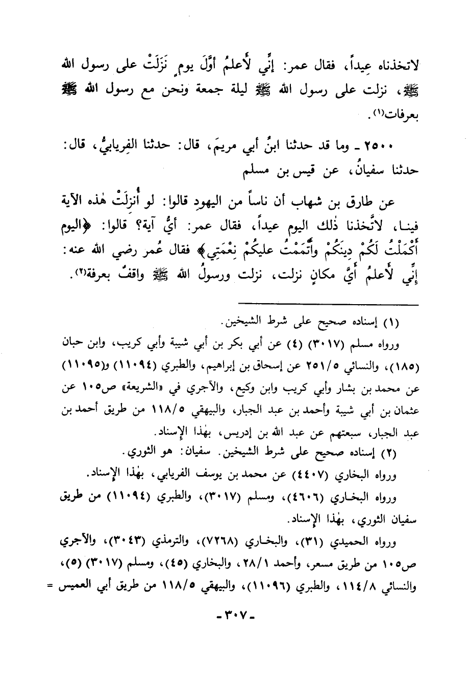 2500 - وَمَا قَدْ حَدَّثَنَا ابْنُ أَبِي مَرْيَمَ، قَالَ: حَدَّثَنَا الْفِرْيَابِيُّ، قَالَ: حَدَّثَنَا سُفْيَانُ، عَنْ قَيْسِ بْنِ مُسْلِمٍ، عَنْ طَارِقِ بْنِ شِهَابٍ أَنَّ نَاسًا مِنَ الْيَهُودِ قَالُوا: لَوْ أُنْزِلَتْ هَذِهِ الْآيَةُ فِينَا لَاتَّخَذْنَا ذَلِكَ الْيَوْمَ عِيدًا. فَقَالَ عُمَرُ: " أَيُّ آيَةٍ؟ قَالُوا: {الْيَوْمَ أَكْمَلْتُ لَكُمْ دِينَكُمْ وَأَتْمَمْتُ عَلَيْكُمْ نِعْمَتِي} [المائدة: 3] . فَقَالَ عُمَرُ رَضِيَ اللهُ عَنْهُ: " إِنِّي لَأَعْلَمُ أَيَّ مَكَانٍ نَزَلَتْ , نَزَلَتْ وَرَسُولُ اللهِ صَلَّى اللَّهُ عَلَيْهِ وَسَلَّمَ وَاقِفٌ بِعَرَفَةَ "