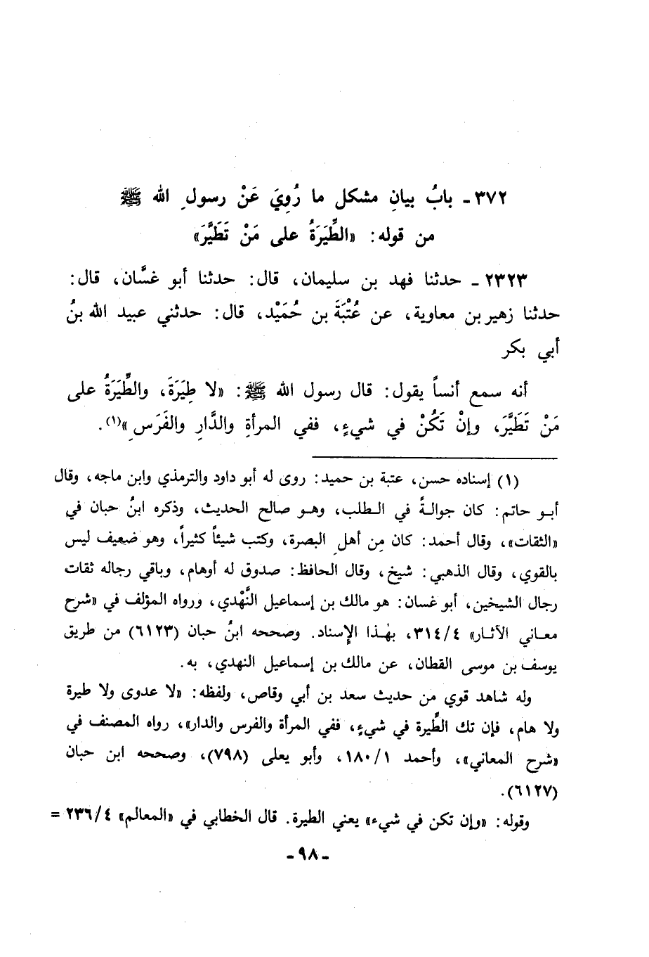 2323 - حَدَّثَنَا فَهْدُ بْنُ سُلَيْمَانَ، قَالَ: حَدَّثَنَا أَبُو غَسَّانَ، قَالَ: حَدَّثَنَا زُهَيْرُ بْنُ مُعَاوِيَةَ، عَنْ عُتْبَةَ بْنِ حُمَيْدٍ، قَالَ: حَدَّثَنِي عُبَيْدُ اللهِ بْنُ أَبِي بَكْرٍ أَنَّهُ سَمِعَ أَنَسًا يَقُولُ: قَالَ رَسُولُ اللهِ صَلَّى اللَّهُ عَلَيْهِ وَسَلَّمَ: " لَا طِيَرَةَ، وَالطِّيَرَةُ عَلَى مَنْ تَطَيَّرَ , وَإِنْ تَكُنْ فِي شَيْءٍ فَفِي الْمَرْأَةِ وَالدَّارِ وَالْفَرَسِ " -[99]- فَقَالَ قَائِلٌ: فِي هَذَا الْحَدِيثِ كَلَامٌ مُتَضَادٌّ ; لِأَنَّ فِيهِ لَا طِيَرَةَ وَذَلِكَ نَفْيٌ لَهَا، وَفِيهِ مَنْ تَطَيَّرَ فَعَلَى نَفْسِهِ فَذَلِكَ إثْبَاتٌ لَهَا. فَكَانَ جَوَابُنَا لَهُ بِتَوْفِيقِ اللهِ وَعَوْنِهِ أَنَّهُ لَا تَضَادَّ فِيهِ كَمَا ظَنَّ، وَأَنَّ قَوْلَهُ لَا طِيَرَةَ عَلَى نَفْيِهَا، وَقَوْلَهُ بَعْدَ ذَلِكَ مَنْ تَطَيَّرَ فَعَلَى نَفْسِهِ لَا أَنَّهُ يَكُونُ بِذَلِكَ مَا تَطَيَّرَ بِهِ عَلَى نَفْسِهِ حَقِيقَتِهِ وَلَكِنْ لَبَّسَهُ عَلَى نَفْسِهِ ; لِأَنَّ الطِّيَرَةَ شِرْكٌ كَمَا قَالَ صَلَّى اللَّهُ عَلَيْهِ وَسَلَّمَ فِيمَا قَدْ رَوَيْنَاهُ فِيمَا تَقَدَّمَ مِنَّا فِي كِتَابِنَا هَذَا أَنَّ الطِّيَرَةَ شِرْكٌ، وَمَا مِنَّا إِلَّا وَلَكِنَّ اللهَ يُذْهِبُهُ بِالتَّوَكُّلِ أَنَّ مَنْ كَانَتْ مِنْهُ الطِّيَرَةُ فَقَدْ دَخَلَ فِي هَذَا الْمَعْنَى، وَكَانَ مَا لَزِمَهُ بِدُخُولِهِ فِيهِ عَلَى نَفْسِهِ لَا عَلَى غَيْرِهِ. وَاللهَ سُبْحَانَهُ وَتَعَالَى نَسْأَلُهُ التَّوْفِيقَ