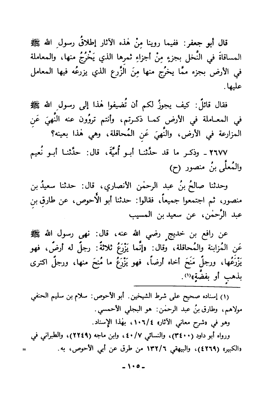 2677 - وَذَكَرَ مَا قَدْ حَدَّثَنَا أَبُو أُمَيَّةَ قَالَ: حَدَّثَنَا أَبُو نُعَيْمٍ، وَالْمُعَلَّى بْنُ مَنْصُورٍ، ح وَحَدَّثَنَا صَالِحُ بْنُ عَبْدِ الرَّحْمَنِ الْأَنْصَارِيُّ قَالَ: حَدَّثَنَا سَعِيدُ بْنُ مَنْصُورٍ، ثُمَّ اجْتَمَعُوا جَمِيعًا , فَقَالُوا: حَدَّثَنَا أَبُو الْأَحْوَصِ، عَنْ طَارِقِ بْنِ عَبْدِ الرَّحْمَنِ، عَنْ سَعِيدِ بْنِ الْمُسَيِّبِ، عَنْ رَافِعِ بْنِ خَدِيجٍ رَضِيَ اللهُ عَنْهُ قَالَ: نَهَى رَسُولُ اللهِ صَلَّى اللَّهُ عَلَيْهِ وَسَلَّمَ عَنِ الْمُزَابَنَةِ وَالْمُحَاقَلَةِ , وَقَالَ: " إِنَّمَا يَزْرَعُ ثَلَاثَةٌ: رَجُلٌ لَهُ أَرْضٌ فَهُوَ يَزْرَعُهَا، وَرَجُلٌ مَنَحَ أَخَاهُ أَرْضًا فَهُوَ يَزْرَعُ مَا مُنِحَ مِنْهَا، وَرَجُلٌ اكْتَرَى بِذَهَبٍ أَوْ بِفِضَّةٍ "