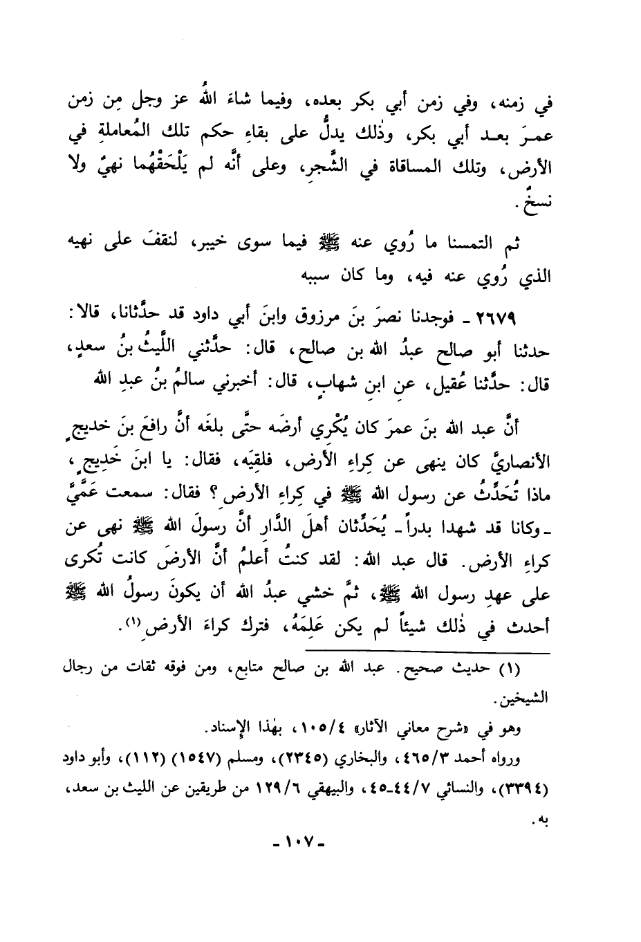 2679 - فَوَجَدْنَا نَصْرَ بْنَ مَرْزُوقٍ، وَابْنَ أَبِي دَاوُدَ قَدْ حَدَّثَانَا قَالَا: حَدَّثَنَا أَبُو صَالِحٍ عَبْدُ اللهِ بْنُ صَالِحٍ قَالَ: حَدَّثَنِي اللَّيْثُ بْنُ سَعْدٍ قَالَ: حَدَّثَنَا عُقَيْلٌ، عَنِ ابْنِ شِهَابٍ قَالَ: أَخْبَرَنِي سَالِمُ بْنُ عَبْدِ اللهِ، أَنَّ عَبْدَ اللهِ بْنَ عُمَرَ كَانَ يُكْرِي أَرْضَهُ حَتَّى بَلَغَهُ أَنَّ رَافِعَ بْنَ خَدِيجٍ الْأَنْصَارِيَّ كَانَ يَنْهَى عَنْ كِرَاءِ الْأَرْضِ فَلَقِيَهُ , فَقَالَ: يَا ابْنَ خَدِيجٍ , مَاذَا تُحَدِّثُ عَنْ رَسُولِ اللهِ صَلَّى اللَّهُ عَلَيْهِ وَسَلَّمَ فِي كِرَاءِ الْأَرْضِ؟ فَقَالَ: سَمِعْتُ عَمَّيَّ وَكَانَا قَدْ شَهِدَا بَدْرًا يُحَدِّثَانِ أَهْلَ الدَّارِ: " أَنَّ رَسُولَ اللهِ صَلَّى اللَّهُ عَلَيْهِ وَسَلَّمَ نَهَى عَنْ كِرَاءِ الْأَرْضِ " قَالَ: عَبْدُ اللهِ: لَقَدْ كُنْتُ أَعْلَمُ أَنَّ الْأَرْضَ كَانَتْ تُكْرَى عَلَى عَهْدِ رَسُولِ اللهِ صَلَّى اللَّهُ عَلَيْهِ وَسَلَّمَ , ثُمَّ خَشِيَ عَبْدُ اللهِ أَنْ يَكُونَ رَسُولُ اللهِ صَلَّى اللَّهُ عَلَيْهِ وَسَلَّمَ أَحْدَثَ فِي ذَلِكَ شَيْئًا لَمْ يَكُنْ عَلِمَهُ فَتَرَكَ كِرَاءَ الْأَرْضِ , -[108]- فَفِي هَذَا عَنِ ابْنِ عُمَرَ أَنَّهُ قَدْ كَانَ عَلِمَ أَنَّ أَرْضًا كَانَتْ تُكْرَى عَلَى عَهْدِ رَسُولِ اللهِ صَلَّى اللَّهُ عَلَيْهِ وَسَلَّمَ , فَقَالَ هَذَا الْقَائِلُ: فَلَيْسَ فِي هَذَا أَنَّهَا كَانَتْ تُكْرَى بِبَعْضِ مَا يَخْرُجُ مِنْهَا وَقَدْ يَجُوزُ أَنْ يَكُونَ كَانَتْ تُكْرَى بِالدَّنَانِيرِ أَوْ بِالدَّرَاهِمِ. فَكَانَ جَوَابُنَا لَهُ فِي ذَلِكَ بِتَوْفِيقِ اللهِ عَزَّ وَجَلَّ وَعَوْنِهِ أَنَّ ابْنَ عُمَرَ لَمْ يُرِدْ بِقَوْلِهِ هَذَا إِلَّا إِعْلَامَ رَافِعٍ أَنَّهُ قَدْ كَانَ عَلِمَ أَنَّ أَرْضًا كَانَتْ تُكْرَى عَلَى عَهْدِ رَسُولِ اللهِ صَلَّى اللَّهُ عَلَيْهِ وَسَلَّمَ عَلَى الْمَعْنَى الَّذِي يُطْلَقُ مَا رَوَى لَهُ رَافِعٌ مِمَّا يَحْظُرُهُ. وَقَدْ رُوِيَ عَنْهُ أَيْضًا مَا يَدُلُّ عَلَى أَنَّ مَعْنَى نَهْيِ رَسُولِ اللهِ صَلَّى اللَّهُ عَلَيْهِ وَسَلَّمَ عَنْ كِرَاءِ الْأَرْضِ بِالثُّلُثِ وَبِالرُّبُعِ لِمَعْنًى كَانُوا يُدْخِلُونَهُ فِي ذَلِكَ مِمَّا يُفْسِدُ الْمُزَارَعَةَ عَلَيْهِ