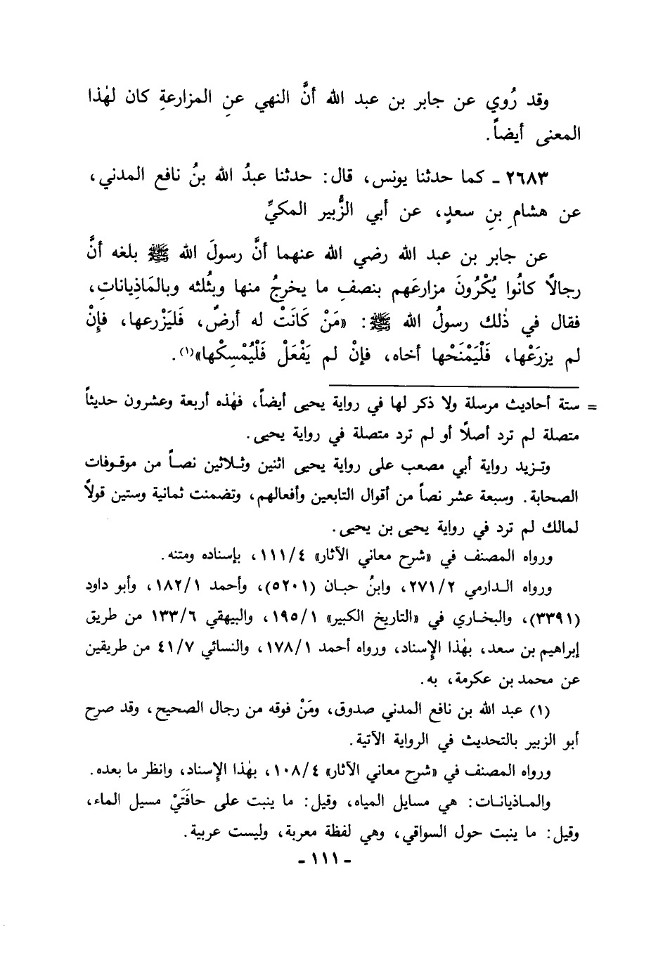 2683 - كَمَا حَدَّثَنَا يُونُسُ قَالَ: حَدَّثَنَا عَبْدُ اللهِ بْنُ نَافِعٍ الْمَدَنِيُّ، عَنْ هِشَامِ بْنِ سَعْدٍ، عَنْ أَبِي الزُّبَيْرِ الْمَكِّيِّ، عَنْ جَابِرِ بْنِ عَبْدِ اللهِ رَضِيَ اللهُ عَنْهُمَا أَنَّ رَسُولَ اللهِ صَلَّى اللَّهُ عَلَيْهِ وَسَلَّمَ بَلَغَهُ أَنَّ رِجَالًا كَانُوا يُكْرُونَ مَزَارِعَهُمْ بِنِصْفِ مَا يَخْرُجُ مِنْهَا وَبِثُلُثِهِ وَبِالْمَاذِيَانَاتِ , فَقَالَ فِي ذَلِكَ رَسُولُ اللهِ صَلَّى اللَّهُ عَلَيْهِ وَسَلَّمَ: " مَنْ كَانَتْ لَهُ أَرْضٌ فَلْيَزْرَعْهَا , فَإِنْ لَمْ يَزْرَعْهَا فَلْيَمْنَحْهَا أَخَاهُ , فَإِنْ لَمْ يَفْعَلْ فَلْيُمْسِكْهَا "