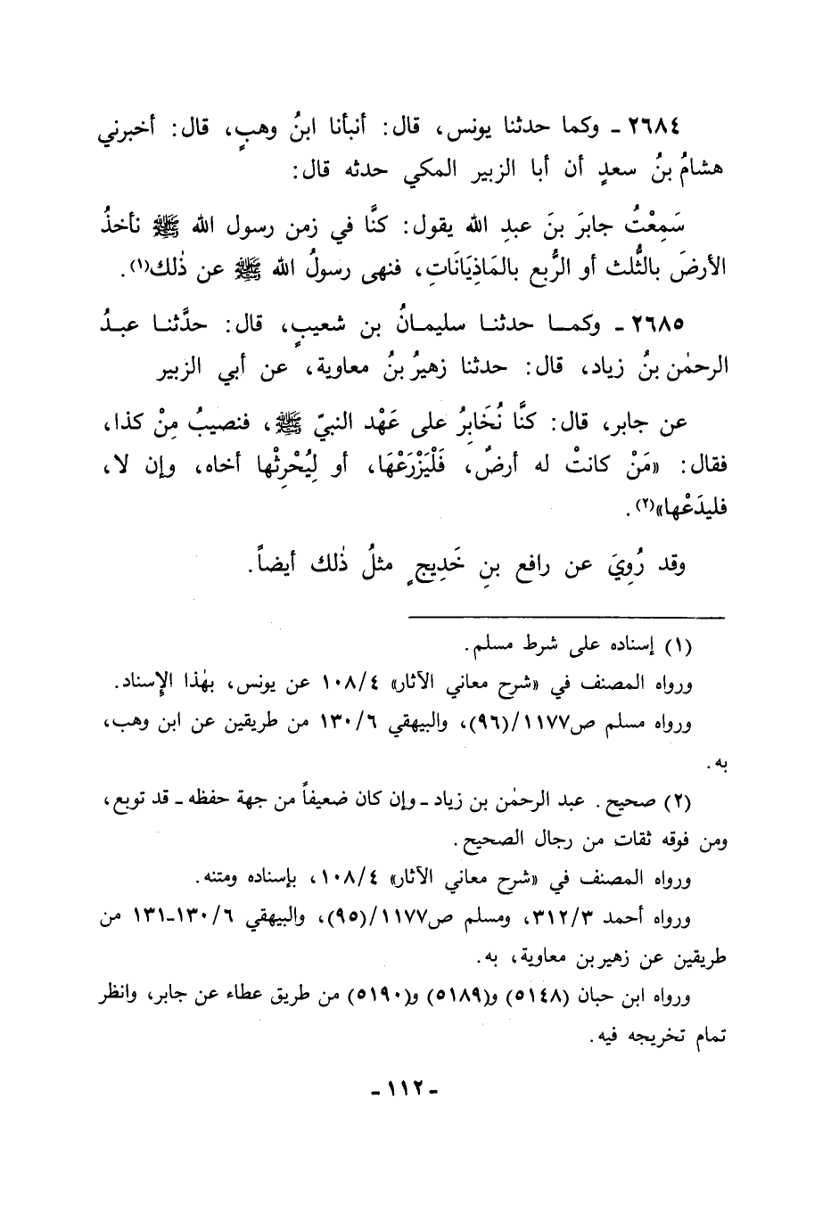 2684 - وَكَمَا حَدَّثَنَا يُونُسُ قَالَ: أَنْبَأَنَا ابْنُ وَهْبٍ قَالَ: أَخْبَرَنِي هِشَامُ بْنُ سَعْدٍ، أَنَّ أَبَا الزُّبَيْرِ الْمَكِّيَّ حَدَّثَهُ قَالَ: سَمِعْتُ جَابِرَ بْنَ عَبْدِ اللهِ يَقُولُ: كُنَّا فِي زَمَنِ رَسُولِ اللهِ صَلَّى اللَّهُ عَلَيْهِ وَسَلَّمَ نَأْخُذُ الْأَرْضَ بِالثُّلُثِ أَوِ الرُّبُعِ بِالْمَاذِيَانَاتِ فَنَهَى رَسُولُ اللهِ صَلَّى اللَّهُ عَلَيْهِ وَسَلَّمَ عَنْ ذَلِكَ "