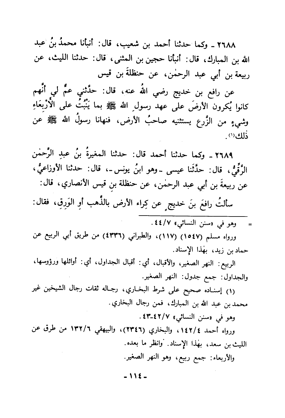 2688 - وَكَمَا حَدَّثَنَا أَحْمَدُ بْنُ شُعَيْبٍ قَالَ: أَنْبَأَنَا مُحَمَّدُ بْنُ عَبْدِ اللهِ بْنِ الْمُبَارَكِ قَالَ: أَنْبَأَنَا حُجَيْنُ بْنُ الْمُثَنَّى قَالَ: حَدَّثَنَا اللَّيْثُ، عَنْ رَبِيعَةَ بْنِ أَبِي عَبْدِ الرَّحْمَنِ، عَنْ حَنْظَلَةَ بْنِ قَيْسٍ، عَنْ رَافِعِ بْنِ خَدِيجٍ رَضِيَ اللهُ عَنْهُ قَالَ: حَدَّثَنِي عَمٌّ لِي: أَنَّهُمْ كَانُوا يُكْرُونَ الْأَرْضَ عَلَى عَهْدِ رَسُولِ اللهِ صَلَّى اللَّهُ عَلَيْهِ وَسَلَّمَ بِمَا يَنْبُتُ عَلَى الْأَرْبَعَاءِ وَشَيْءٍ مِنَ الزَّرْعِ يَسْتَثْنِيهِ صَاحِبُ الْأَرْضِ , فَنَهَانَا رَسُولُ اللهِ صَلَّى اللَّهُ عَلَيْهِ وَسَلَّمَ عَنْ ذَلِكَ "