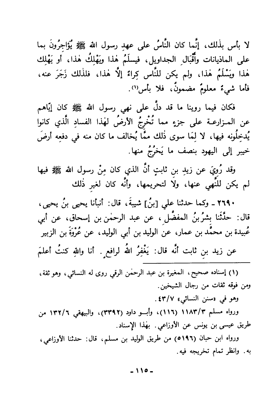 2690 - وَكَمَا حَدَّثَنَا عَلِيُّ بْنُ شَيْبَةَ قَالَ: أَنْبَأَنَا يَحْيَى بْنُ يَحْيَى قَالَ: حَدَّثَنَا بِشْرُ بْنُ الْمُفَضَّلِ، عَنْ عَبْدِ الرَّحْمَنِ بْنِ إِسْحَاقَ، عَنْ أَبِي عُبَيْدَةَ بْنِ مُحَمَّدِ بْنِ عَمَّارٍ، عَنِ الْوَلِيدِ بْنِ أَبِي الْوَلِيدِ، عَنْ عُرْوَةَ بْنِ الزُّبَيْرِ، عَنْ زَيْدِ بْنِ ثَابِتٍ أَنَّهُ قَالَ: يَغْفِرُ اللهُ لِرَافِعٍ: أَنَا وَاللهِ، كُنْتُ أَعْلَمُ -[116]- بِالْحَدِيثِ مِنْهُ إِنَّمَا أَتَى رَجُلَانِ مِنَ الْأَنْصَارِ إِلَى رَسُولِ اللهِ صَلَّى اللَّهُ عَلَيْهِ وَسَلَّمَ قَدِ اقْتَتَلَا , فَقَالَ: " إِنْ كَانَ هَذَا شَأْنَكُمْ فَلَا تُكْرُوا الْمَزَارِعَ " فَسَمِعَ لَا تُكْرُوا الْمَزَارِعَ " وَقَدْ رُوِيَ عَنِ ابْنِ عَبَّاسٍ فِي ذَلِكَ أَيْضًا