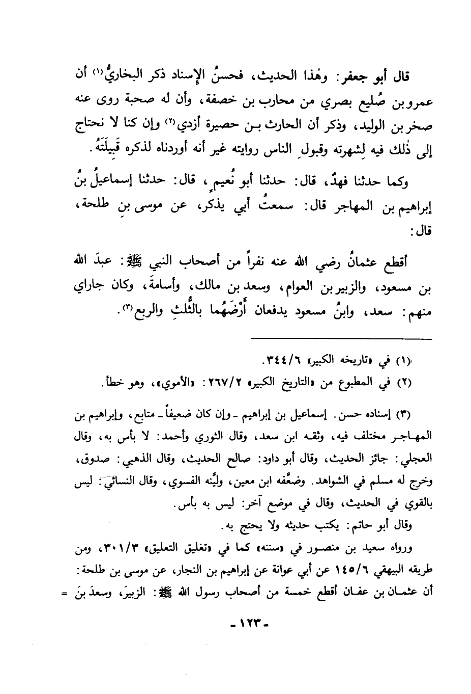 وَكَمَا حَدَّثَنَا فَهْدٌ قَالَ: حَدَّثَنَا أَبُو نُعَيْمٍ قَالَ: حَدَّثَنَا إِسْمَاعِيلُ بْنُ إِبْرَاهِيمَ بْنِ الْمُهَاجِرِ قَالَ: سَمِعْتُ أَبِي يَذْكُرُ عَنْ مُوسَى بْنِ طَلْحَةَ قَالَ: أَقْطَعَ عُثْمَانُ رَضِيَ اللهُ عَنْهُ نَفَرًا مِنْ أَصْحَابِ النَّبِيِّ صَلَّى اللَّهُ عَلَيْهِ وَسَلَّمَ عَبْدَ اللهِ بْنَ مَسْعُودٍ، وَالزُّبَيْرَ بْنَ الْعَوَّامِ، وَسَعْدَ بْنَ مَالِكٍ، وَأُسَامَةَ وَكَانَ جَارَايَ مِنْهُمْ سَعْدٌ، وَابْنُ مَسْعُودٍ يَدْفَعَانِ أَرْضَهُمَا بِالثُّلُثِ وَالرُّبُعِ