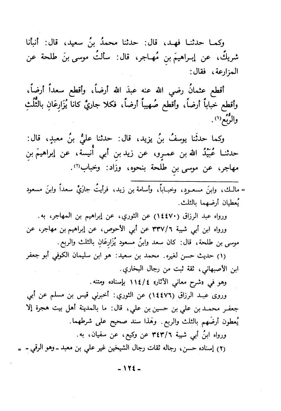 وَكَمَا حَدَّثَنَا فَهْدٌ قَالَ: حَدَّثَنَا مُحَمَّدُ بْنُ سَعِيدٍ قَالَ: أَنْبَأَنَا شَرِيكٌ، عَنْ إِبْرَاهِيمَ بْنِ مُهَاجِرٍ قَالَ: سَأَلْتُ مُوسَى بْنَ طَلْحَةَ عَنِ الْمُزَارَعَةِ , فَقَالَ: أَقْطَعَ عُثْمَانُ رَضِيَ اللهُ عَنْهُ عَبْدَ اللهِ أَرْضًا، وَأَقْطَعَ سَعْدًا أَرْضًا، وَأَقْطَعَ خَبَّابًا أَرْضًا، وَأَقْطَعَ صُهَيْبًا أَرْضًا , فَكِلَا جَارَيَّ كَانَا يُزَارعَانِ بِالثُّلُثِ وَالرُّبُعِ وَكَمَا حَدَّثَنَا يُوسُفُ بْنُ يَزِيدَ قَالَ: حَدَّثَنَا عَلِيُّ بْنُ مَعْبَدٍ قَالَ: حَدَّثَنَا عُبَيْدُ اللهِ بْنُ عَمْرٍو، عَنْ زَيْدِ بْنِ أَبِي أُنَيْسَةَ , عَنْ إِبْرَاهِيمَ بْنِ مُهَاجِرٍ , عَنْ مُوسَى بْنِ طَلْحَةَ بِنَحْوِهِ , وَزَادَ: وَخَبَّابٌ -[125]- وَفِي ذَلِكَ مَا هُوَ أَعْلَى مِنْ هَذَا وَهُوَ مَا كَانُوا عَلَيْهِ بِالْيَمَنِ لَمَّا قَدِمَ عَلَيْهِمْ مُعَاذُ بْنُ جَبَلٍ عَامِلًا عَلَيْهَا عَلَى عَهْدِ رَسُولِ اللهِ صَلَّى اللَّهُ عَلَيْهِ وَسَلَّمَ