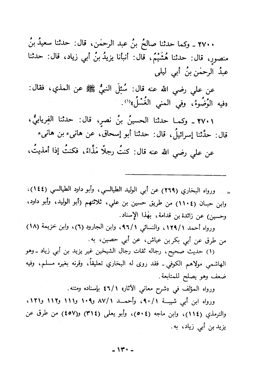 2701 - وَكَمَا حَدَّثَنَا الْحُسَيْنُ بْنُ نَصْرٍ قَالَ: حَدَّثَنَا الْفِرْيَابِيُّ قَالَ: حَدَّثَنَا إِسْرَائِيلُ قَالَ: حَدَّثَنَا أَبُو إِسْحَاقَ، عَنْ هَانِئِ بْنِ هَانِئٍ، عَنْ عَلِيٍّ رَضِيَ اللهُ عَنْهُ قَالَ: كُنْتُ رَجُلًا مَذَّاءً , فَكُنْتُ إِذَا أَمْذَيْتُ -[131]- اغْتَسَلْتُ , فَسَأَلْتُ النَّبِيَّ صَلَّى اللَّهُ عَلَيْهِ وَسَلَّمَ , فَقَالَ: " فِيهِ الْوُضُوءُ "