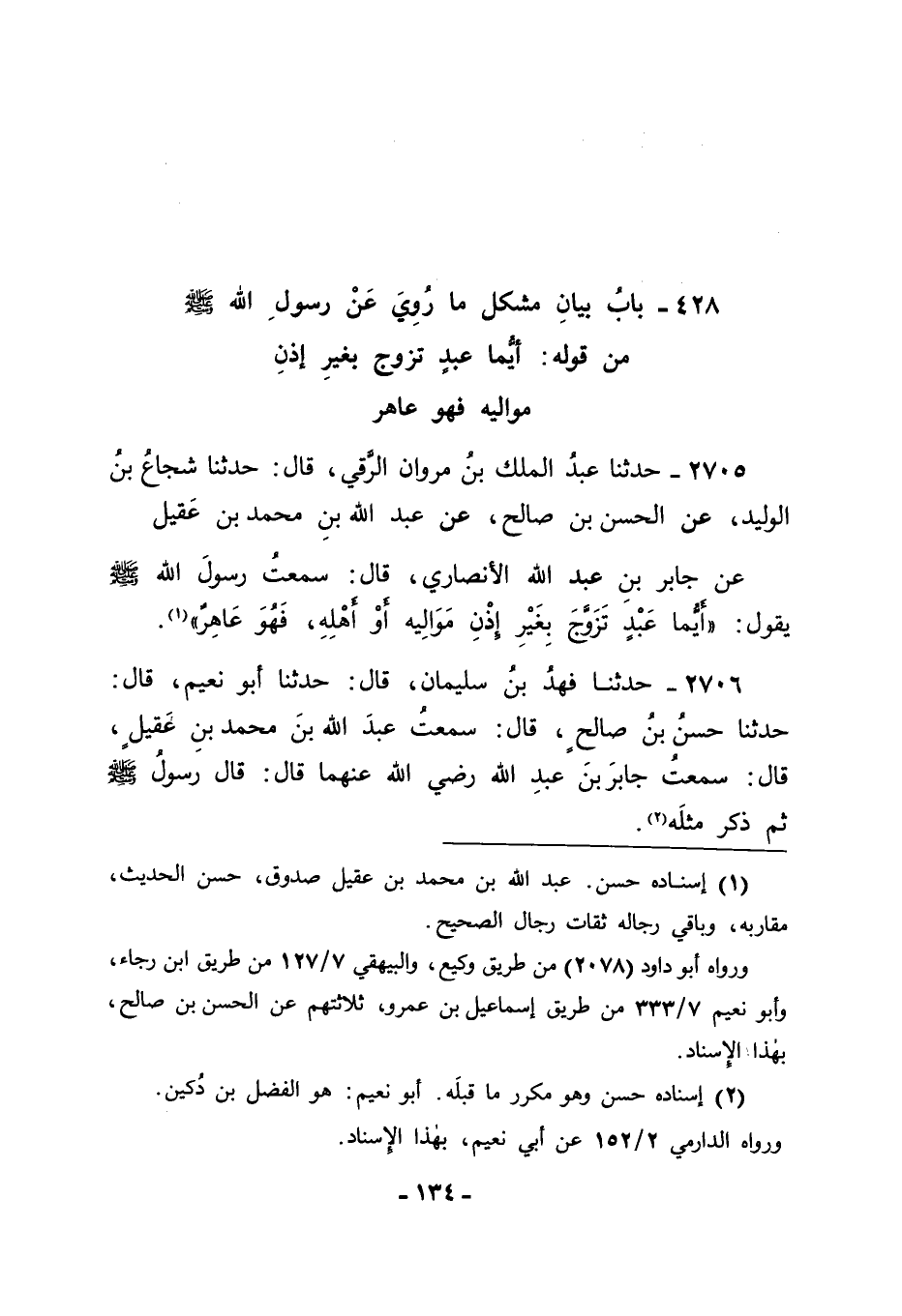 2705 - حَدَّثَنَا عَبْدُ الْمَلِكِ بْنُ مَرْوَانَ الرَّقِّيُّ قَالَ: حَدَّثَنَا شُجَاعُ بْنُ الْوَلِيدِ، عَنِ الْحَسَنِ بْنِ صَالِحٍ، عَنْ عَبْدِ اللهِ بْنِ مُحَمَّدِ بْنِ عَقِيلٍ، عَنْ جَابِرِ بْنِ عَبْدِ اللهِ الْأَنْصَارِيِّ قَالَ: سَمِعْتُ رَسُولَ اللهِ صَلَّى اللَّهُ عَلَيْهِ وَسَلَّمَ يَقُولُ: " أَيُّمَا عَبْدٍ تَزَوَّجَ بِغَيْرِ إِذْنِ مَوَالِيهِ أَوْ أَهْلِهِ فَهُوَ عَاهِرٌ "