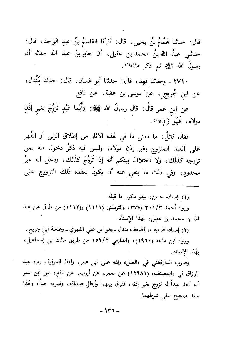 2710 - وَحَدَّثَنَا فَهْدٌ قَالَ: حَدَّثَنَا أَبُو غَسَّانَ قَالَ: حَدَّثَنَا مِنْدَلٌ، عَنِ ابْنُ جُرَيْجٍ، عَنْ مُوسَى بْنِ عُقْبَةَ، عَنْ نَافِعٍ، عَنِ ابْنِ عُمَرَ قَالَ: قَالَ رَسُولُ اللهِ صَلَّى اللَّهُ عَلَيْهِ وَسَلَّمَ: " أَيُّمَا عَبْدٍ تَزَوَّجَ بِغَيْرِ إِذْنِ مَوْلَاهُ فَهُوَ زَانٍ " , فَقَالَ قَائِلٌ: مَا مَعْنَى مَا فِي هَذِهِ الْآثَارِ مِنْ إِطْلَاقِ الزِّنَى أَوِ الْعَهْرِ عَلَى الْعَبْدِ الْمُتَزَوِّجِ بِغَيْرِ إِذْنِ مَوْلَاهُ وَلَيْسَ فِيهِ ذِكْرُ دُخُولٍ مِنْهُ بِمَنْ تَزَوَّجَهُ كَذَلِكَ , وَلَا اخْتِلَافَ بَيْنَكُمْ أَنَّهُ إِذَا تَزَوَّجَ كَذَلِكَ وَدَخَلَ أَنَّهُ غَيْرُ مَحْدُودٍ وَفِي ذَلِكَ مَا يَنْفِي عَنْهُ أَنْ يَكُونَ بِعَقْدِهِ ذَلِكَ التَّزْوِيجَ عَلَى -[137]- نَفْسِهِ كَمَا فِي هَذَا الْحَدِيثِ مِمَّا أَطْلَقَهُ عَلَيْهِ بِذَلِكَ؟ فَكَانَ جَوَابُنَا لَهُ فِي ذَلِكَ بِتَوْفِيقِ اللهِ عَزَّ وَجَلَّ وَعَوْنِهِ أَنَّهُ أَطْلَقَ عَلَيْهِ مَا أَطْلَقَ عَلَيْهِ فِي هَذِهِ الْآثَارِ لِلتَّزْوِيجِ الَّذِي يَكُونُ سَبَبًا لِلدُّخُولِ الَّذِي يَكُونُ بِهِ كَمَا أُطْلِقَ عَلَيْهِ فِي هَذِهِ الْآثَارِ فَسُمِّيَ سَبَبُهُ بِاسْمِهِ كَمَا رُوِيَ عَنْ رَسُولِ اللهِ صَلَّى اللَّهُ عَلَيْهِ وَسَلَّمَ فِي تَسْمِيَتِهِ الْأَشْيَاءَ الَّتِي يُتَوَصَّلُ إِلَى الزِّنَى بِهَا الزِّنَى الَّذِي هُوَ اسْمٌ لِحَقِيقَةِ مَا يَكُونُ بِهَا