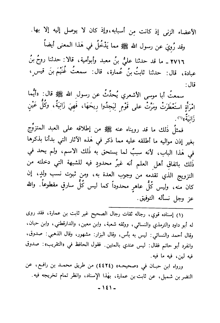 2716 - مَا قَدْ حَدَّثَنَا عَلِيُّ بْنُ مَعْبَدٍ، وَأَبُو أُمَيَّةَ قَالَا: حَدَّثَنَا رَوْحُ بْنُ عُبَادَةَ قَالَ: حَدَّثَنَا ثَابِتُ بْنُ عُمَارَةَ قَالَ: سَمِعْتُ غُنَيْمَ بْنَ قَيْسٍ قَالَ: سَمِعْتُ أَبَا مُوسَى الْأَشْعَرِيَّ يُحَدِّثُ عَنِ النَّبِيِّ صَلَّى اللَّهُ عَلَيْهِ وَسَلَّمَ قَالَ: " أَيُّمَا امْرَأَةٍ اسْتَعْطَرَتْ وَمَرَّتْ عَلَى قَوْمٍ لِيَجِدُوا رِيحَهَا فَهِيَ زَانِيَةٌ , وَكُلُّ عَيْنٍ زَانِيَةٌ " فَمِثْلُ ذَلِكَ مَا قَدْ رَوَيْنَاهُ عَنْهُ صَلَّى اللَّهُ عَلَيْهِ وَسَلَّمَ مِنْ إِطْلَاقِهِ عَلَى الْعَبْدِ الْمُتَزَوِّجِ بِغَيْرِ إِذْنِ مَوَالِيهِ مَا أَطْلَقَهُ عَلَيْهِ مِمَّا ذَكَرَ فِي هَذِهِ الْآثَارِ الَّتِي بَدَأْنَا بِذِكْرِهَا فِي هَذَا الْبَابِ، لِأَنَّهُ سَبَبٌ لِمَا يَسْتَحِقُّ بِهِ ذَلِكَ الِاسْمَ. وَلَمْ يُحَدَّ فِي ذَلِكَ بِاتِّفَاقِ أَهْلِ الْعِلْمِ أَنَّهُ غَيْرُ مَحْدُودٍ فِيهِ لِلشُّبْهَةِ الَّتِي دَخَلَتْهُ مِنَ التَّزْوِيجِ الَّذِي تَقَدَّمَهُ مِنْ وُجُوبِ الْعِدَّةِ بِهِ وَمِنْ ثُبُوتِ نَسَبِ وَلَدٍ إِنْ كَانَ مِنْهُ , وَلَيْسَ كُلُّ عَاهِرٍ مَحْدُودًا كَمَا لَيْسَ كُلُّ سَارِقٍ مَقْطُوعًا , وَاللهَ عَزَّ وَجَلَّ نَسْأَلُهُ التَّوْفِيقَ