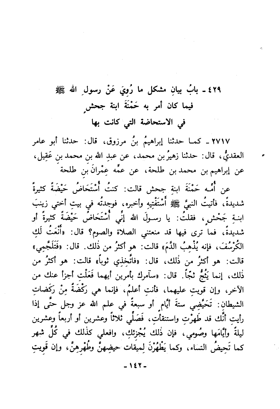 2717 - كَمَا حَدَّثَنَا إِبْرَاهِيمُ بْنُ مَرْزُوقٍ قَالَ: حَدَّثَنَا أَبُو عَامِرٍ الْعَقَدِيُّ قَالَ: حَدَّثَنَا زُهَيْرُ بْنُ مُحَمَّدٍ، عَنْ عَبْدِ اللهِ بْنِ مُحَمَّدِ بْنِ عَقِيلٍ، عَنْ إِبْرَاهِيمَ بْنِ مُحَمَّدِ بْنِ طَلْحَةَ، عَنْ عَمِّهِ عِمْرَانَ بْنِ طَلْحَةَ، عَنْ أُمِّهِ حَمْنَةَ ابْنَةِ جَحْشٍ قَالَتْ: كُنْتُ أُسْتَحَاضُ حَيْضَةً كَثِيرَةً شَدِيدَةً , فَأَتَيْتُ النَّبِيَّ صَلَّى اللَّهُ عَلَيْهِ وَسَلَّمَ أَسْتَفْتِيهِ وَأُخْبِرُهُ , فَوَجَدْتُهُ فِي بَيْتِ أُخْتِي زَيْنَبَ ابْنَةِ جَحْشٍ , فَقُلْتُ: يَا رَسُولَ اللهِ , إِنِّي أُسْتَحَاضُ حَيْضَةً كَثِيرَةً أَوْ شَدِيدَةً , فَمَا تَرَى فِيهَا قَدْ مَنَعَتْنِي الصَّلَاةَ وَالصَّوْمَ؟ قَالَ: " أَنْعَتُ لَكِ الْكُرْسُفَ فَإِنَّهُ يُذْهِبُ الدَّمَ "، قَالَتْ: هُوَ أَكْثَرُ مِنْ ذَلِكَ. قَالَ: " فَتَلَجَّمِي "، قَالَتْ: هُوَ أَكْثَرُ مِنْ ذَلِكَ قَالَ: " فَاتَّخِذِي ثَوْبًا "، قَالَتْ: هُوَ أَكْثَرُ مِنْ ذَلِكَ، إِنَّمَا يَثُجُّ ثَجًّا. قَالَ: " سَآمُرُكِ بِأَمْرَيْنِ أَيَّهُمَا فَعَلْتِ أَجْزَأَ عَنْكِ مِنَ الْآخَرِ، وَإِنْ قَوِيَتْ عَلَيْهِمَا , فَأَنْتِ أَعْلَمُ فَإِنَّمَا هِيَ رَكْضَةٌ مِنْ رَكَضَاتِ الشَّيْطَانِ تَحَيَّضِي سِتَّةَ أَيَّامٍ أَوْ سَبْعَةً فِي عِلْمِ اللهِ عَزَّ وَجَلَّ حَتَّى إِذَا رَأَيْتِ أَنَّكِ قَدْ طَهُرْتِ وَاسْتَنْقَأْتِ فَصَلِّي ثَلَاثًا وَعِشْرِينَ أَوْ أَرْبَعًا وَعِشْرِينَ لَيْلَةً وَأَيَّامَهَا وَصُومِي , فَإِنَّ ذَلِكَ يُجْزِئُكِ وَافْعَلِي كَذَلِكَ فِي كُلِّ شَهْرٍ كَمَا تَحِيضُ النِّسَاءُ، وَكَمَا يَطْهُرْنَ لِمِيقَاتِ حَيْضِهِنَّ وَطُهْرِهِنَّ وَإِنْ قَوِيتِ -[143]- عَلَى أَنْ تُؤَخِّرِي الظُّهْرَ وَتُعَجِّلِي الْعَصْرَ وَتَغْتَسِلِي , ثُمَّ تَجْمَعِي بَيْنَ الظُّهْرِ وَالْعَصْرِ وَتُؤَخِّرِي الْمَغْرِبَ وَتُعَجِّلِي الْعِشَاءَ , ثُمَّ تَغْتَسِلِي وَتَجْمَعِي بَيْنَ الصَّلَاتَيْنِ فَافْعَلِي وَتَغْتَسِلِي مَعَ الْفَجْرِ فَصَلِّي وَصُومِي إِنْ قَدَرْتِ عَلَى ذَلِكَ " قَالَ رَسُولُ اللهِ صَلَّى اللَّهُ عَلَيْهِ وَسَلَّمَ: " وَهَذَا أَعْجَبُ الْأَمْرَيْنِ إِلَيَّ "