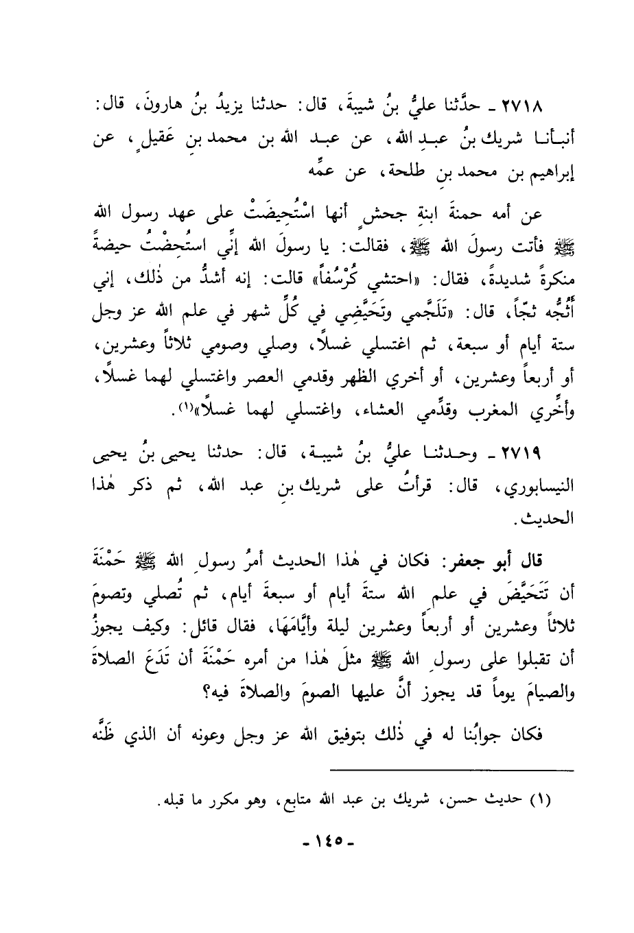 2718 - حَدَّثَنَا عَلِيُّ بْنُ شَيْبَةَ قَالَ: حَدَّثَنَا يَزِيدُ بْنُ هَارُونَ قَالَ: أَنْبَأَنَا شَرِيكُ بْنُ عَبْدِ اللهِ، عَنْ عَبْدِ اللهِ بْنِ مُحَمَّدِ بْنِ عَقِيلٍ، عَنْ إِبْرَاهِيمَ بْنِ مُحَمَّدِ بْنِ طَلْحَةَ، عَنْ عَمِّهِ، عَنْ أُمِّهِ حَمْنَةَ ابْنَةِ جَحْشٍ أَنَّهَا اسْتُحِيضَتْ عَلَى عَهْدِ رَسُولِ اللهِ صَلَّى اللَّهُ عَلَيْهِ وَسَلَّمَ , فَأَتَتْ رَسُولَ اللهِ صَلَّى اللَّهُ عَلَيْهِ وَسَلَّمَ , فَقَالَتْ: يَا رَسُولَ اللهِ , إِنِّي اسْتُحِضْتُ حَيْضَةً مُنْكَرَةً شَدِيدَةً , فَقَالَ: " احْتَشِي كُرْسُفًا " قَالَتْ: إِنَّهُ أَشَدُّ مِنْ ذَلِكَ إِنِّي أَثُجُّهُ ثَجًّا. قَالَ: " تَلَجَّمِي وَتَحَيَّضِي فِي كُلِّ شَهْرٍ فِي عِلْمِ اللهِ عَزَّ وَجَلَّ سِتَّةَ أَيَّامٍ أَوْ سَبْعَةَ، ثُمَّ اغْتَسِلِي غُسْلًا وَصَلِّي وَصُومِي ثَلَاثًا وَعِشْرِينَ أَوْ أَرْبَعًا وَعِشْرِينَ , أَوْ أَخِّرِي الظُّهْرَ وَقَدِّمِي الْعَصْرَ وَاغْتَسِلِي لَهُمَا غُسْلًا وَأَخِّرِي الْمَغْرِبَ وَقَدِّمِي الْعِشَاءَ وَاغْتَسِلِي لَهُمَا غُسْلًا "