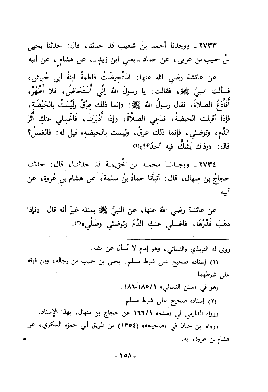 2733 - وَوَجَدْنَا أَحْمَدَ بْنَ شُعَيْبٍ قَدْ حَدَّثَنَا قَالَ: حَدَّثَنَا يَحْيَى بْنُ حَبِيبِ بْنِ عَرَبِيٍّ، عَنْ حَمَّادٍ يَعْنِي ابْنَ زَيْدٍ , عَنْ هِشَامٍ، عَنْ أَبِيهِ، عَنْ عَائِشَةَ رَضِيَ اللهُ عَنْهَا: اسْتُحِيضَتْ فَاطِمَةُ ابْنَةُ أَبِي حُبَيْشٍ , فَسَأَلَتِ النَّبِيَّ صَلَّى اللَّهُ عَلَيْهِ وَسَلَّمَ , فَقَالَتْ: يَا رَسُولَ اللهِ , إِنِّي أُسْتَحَاضُ , فَلَا أَطْهُرُ , أَفَأَدَعُ الصَّلَاةَ , فَقَالَ رَسُولُ اللهِ صَلَّى اللَّهُ عَلَيْهِ وَسَلَّمَ: " إِنَّمَا ذَلِكَ عِرْقٌ وَلَيْسَتْ بِالْحَيْضَةِ , فَإِذَا أَقْبَلَتِ الْحَيْضَةُ , فَدَعِي الصَّلَاةَ , وَإِذَا أَدْبَرَتْ , فَاغْسِلِي عَنْكِ أَثَرَ الدَّمِ , وَتَوَضَّئِي؛ فَإِنَّمَا ذَلِكَ عِرْقٌ , وَلَيْسَتْ بِالْحَيْضَةِ ". قِيلَ لَهُ: فَالْغُسْلُ؟ قَالَ: " وَذَاكَ يَشُكُّ فِيهِ أَحَدٌ؟ "